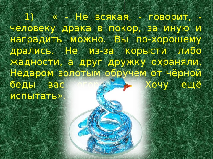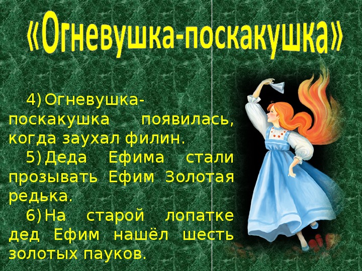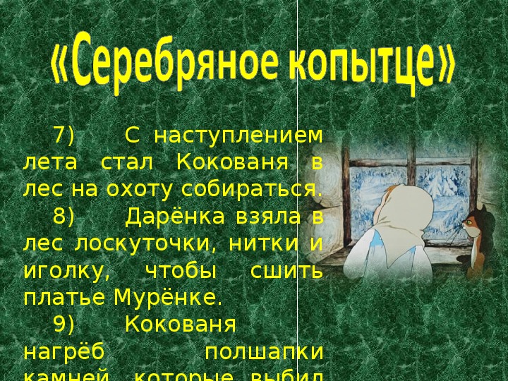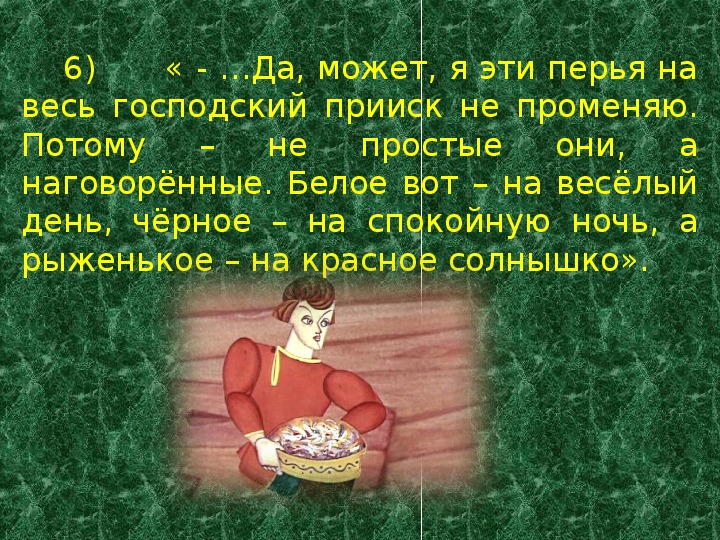 Презентация предназначена для закрепления усвоенных знаний по сказам Петра Петровича Бажова. В данной презентации представлена игра, которая состоит из пяти этапов. В данной игре участвуют две команды по 7-8 человек. Здесь же можно найти занимательные задания для вовлечения в игровой процесс зрительного зала