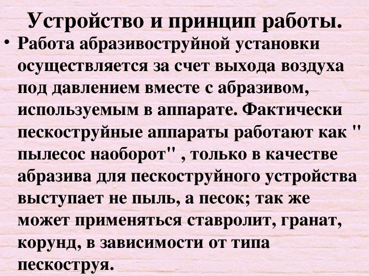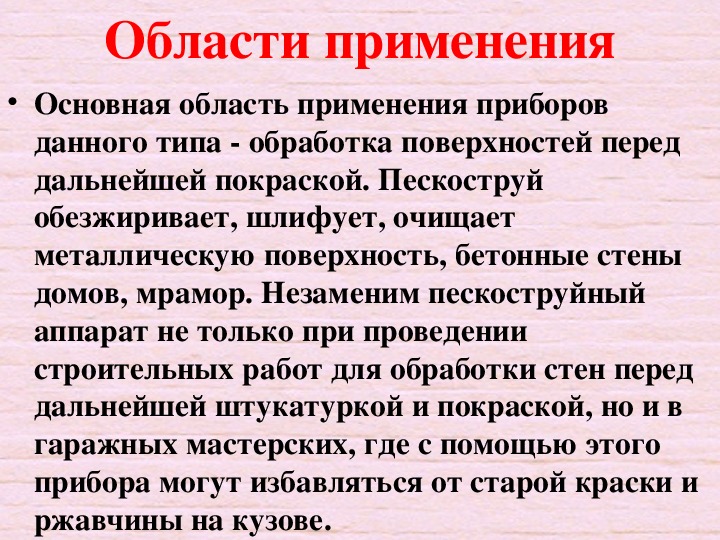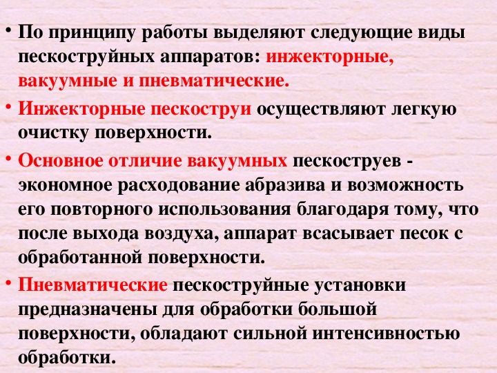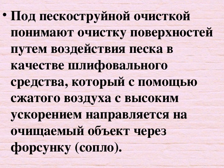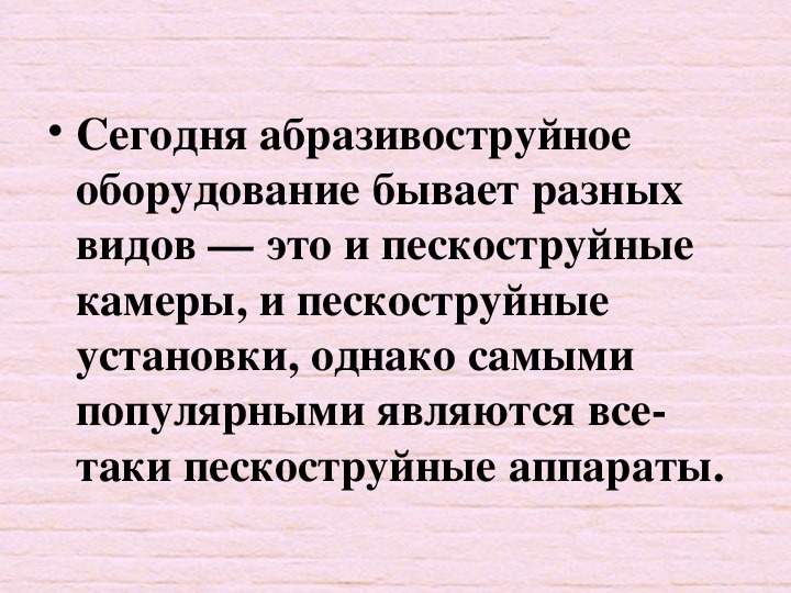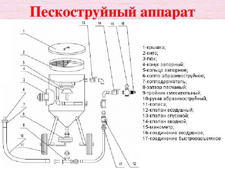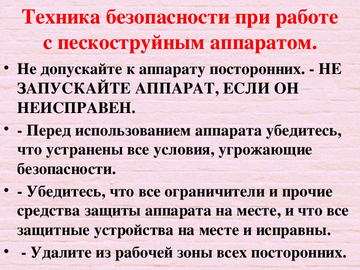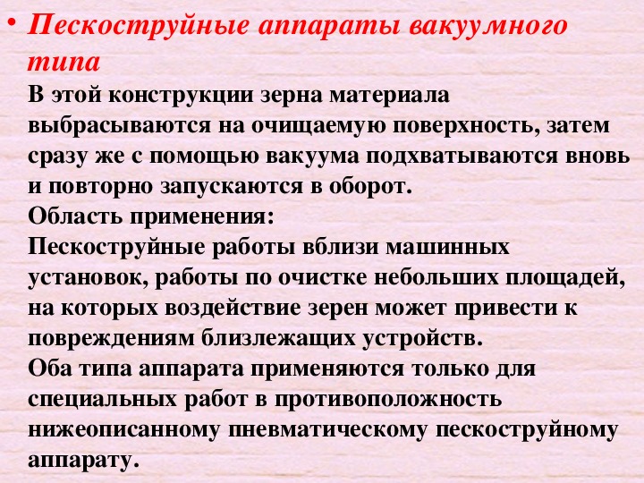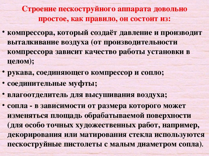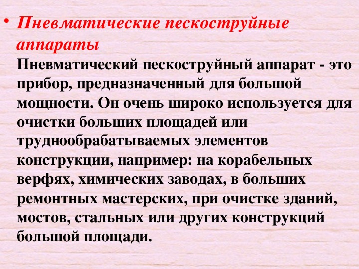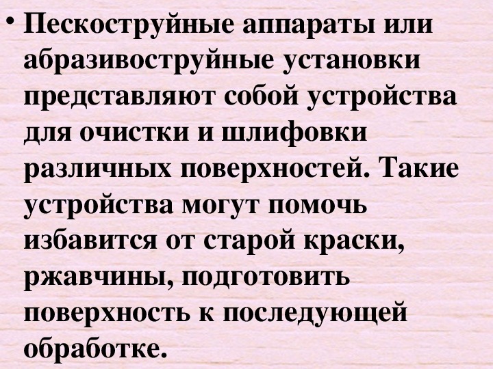 Из презентации можно узнать, что представляют из себя пескоструйные аппараты или абразивоструйные установки, об видах аппаратов; об строении пескоструйного аппарата; области применения; об предупреждениях и рекомендациях перед пуском; о устранение неисправностей и техники безопасности. Презентация составлена к Разделу 3 Механизация работ, МДК 04.02 МЕХАНИЗАЦИЯ РАБОТ