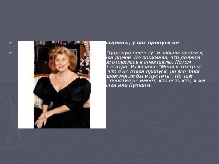 Презентация по музыке. Тема урока: Образцова Елена Васильевна (9 класс). Петь Лена начала рано, с 5 лет. Голосок был тоненьким, комариным. Пела то, что слышала вокруг, главным образом, вальсы Штрауса. Когда пошла в школу, уроки делала исключительно под музыку - пела сама или слушала пластинки. Часами сидела у репродуктора во время оперных передач. Музыка с детства была для нее не дополнением к жизни, а неотъемлемой ее частью.Презентация по музыке. Тема урока: Образцова Елена Васильевна (9 класс).