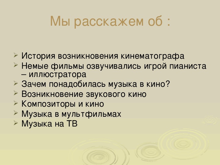 Презентация по музыке. Тема урока: Возможности музыки в киноискусстве (9 класс). Эта идея интересна нам и ,наверное, интересна другим людям. Для того, чтобы идея стала интересна всем, мы попытаемся раскрыть роль музыки в киноискусстве. Выявить взаимосвязь музыки и киноискусства, и рассмотреть на примерах.Презентация по музыке. Тема урока: Возможности музыки в киноискусстве (9 класс).