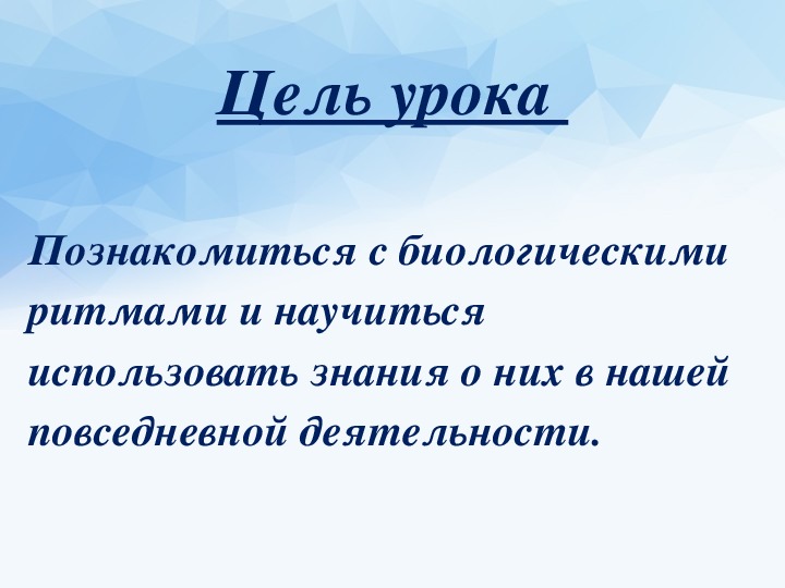 Презентация к уроку в 10 классе по теме Биологические ритмы и их влияние на работоспособность человека из модуля № 2 Основы медицинских знаний и здорового образа жизни.В презентации переставлены имена ученых , которые занимались разработкой биологических ритмов, а также определение собственного биологического ритма на основе теста .