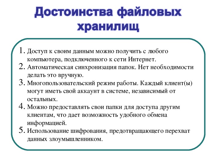 1.Доступ к своим данным можно получить с любого компьютера, подключенного к сети Интернет.2.Автоматическая синхронизация папок. Нет необходимости делать это вручную.3.Многопользовательский режим работы. Каждый клиент(ы) могут иметь свой аккаунт в системе, независимый от остальных.4.Можно предоставлять свои папки для доступа другим клиентам, что дает возможность удобного обмена информацией.5.Использование шифрования, предотвращающего перехват данных злоумышленником.