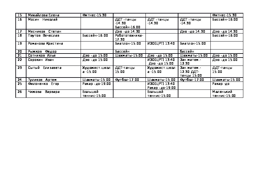 Занятость учащихся 3А класса на 2017 – 2018 учебный год № 1 2 3 Ф.И.ученика Алексеева Екатерина Аюбов Темир Бровин Илья 4 5 6 7 8 9 10 11 12 Викторов Гордей Гольтиссон Анна Дронова Анастасия Замышляева Таисия Коробейникова Анна Коробицын Илья Ламасова Дарья Лаврентьев Дмитрий Мальцева Анастасия 13 14 Мельников Илья Мигров Станислав Понедельник Танцы-16.30 тхеквандо Спортивные танцы 14.30 Дзю-до-15.30 Театр-17.00 Муз.шк.15.20 Цветочная фантазия 14.30 Лечебная гимнастика17.0 0 Волейбол-15.30 Танцы-16.30 Вторник Хор -14.00 Футбол-17.00 Бассейн-15.00 ДДТ –танцы 16.00 ДДТ –танцы 16.00 Балтика Среда ИЗО(ЦРТ) 13.40 Танцы-16.30 ИЗО(ЦРТ) 13.40 ИЗО(ЦРТ) 13.40 тхеквандо ИЗО(ЦРТ) 13.40 Спортивные танцы 14.30 ИЗО(ЦРТ) 13.40 ИЗО(ЦРТ) 13.40 Балтика Шахматы-15.00 Дзю-до-15.30 Театр-17.00 Фитнес 15.00 ИЗО(ЦРТ) 13.40 ИЗО(ЦРТ) 13.40 Биатлон-14.00 Фитнес 15.00 ИЗО(ЦРТ) 13.40 Танцы-16.30 Волейбол-15.30 ИЗО(ЦРТ) 13.40 Танцы-16.30 Танцы-16.30 Четверг Пятница Футбол-17.00 Бассейн-15.00 Футбол-17.00 Танцы-16.30 Зан.матем.- 12.30 ДДТ – танцы 16.00 Зан.матем.- 12.30 Зан.матем.- 12.30 ДДТ –танцы 16.00 тхеквандо ДДТ –танцы 16.00 Спортивные танцы 14.30 ДДТ –танцы 16.00 Балтика Шахматы-15.00 Бассейн-18.00 Муз.шк.15.20 Дзю-до-15.30 Фитнес 15.00 Биатлон-14.00 бассейн Зан.матем.- 12.30 Цветочная фантазия 14.30 Лечебная гимнастика17.0 0 Бассей16.20 Танцы-16.3015 16 17 18 19 20 21 22 23 24 25 26 Михайлова Елена Мосин Николай Мясников Степан Паутов Вячеслав Романова Кристина Рыжков Федор Сотников Илья Сорокин Иван Сытый Елизавета Туликов Артем Филоненко Егор Чижова Варвара Фитнес-15.30 Бассейн-16.00 ДДТ –танцы -14.30 Бассейн-16.00 Дзю –до 14.30 Робототехника- 17.30 Биатлон-15.00 ДДТ –танцы -14.30 ДДТ –танцы -14.30 Дзю –до 14.30 ИЗО(ЦРТ) 13.40 Биатлон-15.00 Фитнес-15.30 Бассейн-16.00 Дзю –до 14.30 Бассейн-16.00 Бассейн Дзю –до 15.00 Шахматы-15.00 Дзю –до 15.00 ИЗО(ЦРТ) 13.40 Дзю –до 15.00 Дзю –до 15.00 Художест.школ а -15.00 Художест.школ а -15.00 ДДТ-танцы 15.00 Шахматы-15.00 Футбол-17.00 Ракар –до-19.00 Большой теннис-15.00 бассейн Шахматы-15.00 Дзю –до 15.00 Дзю –до 15.00 Зан.матем.- 12.30 Зан.матем.- 12.30 ДДТ- танцы 15.00 Шахматы-15.00 Футбол-17.00 ИЗО(ЦРТ) 13.40 Ракар –до-19.00 Большой теннис-15.00 Маленький теннис-15.00 ДДТ-танцы 15.00 Шахматы-15.00 Ракар -до