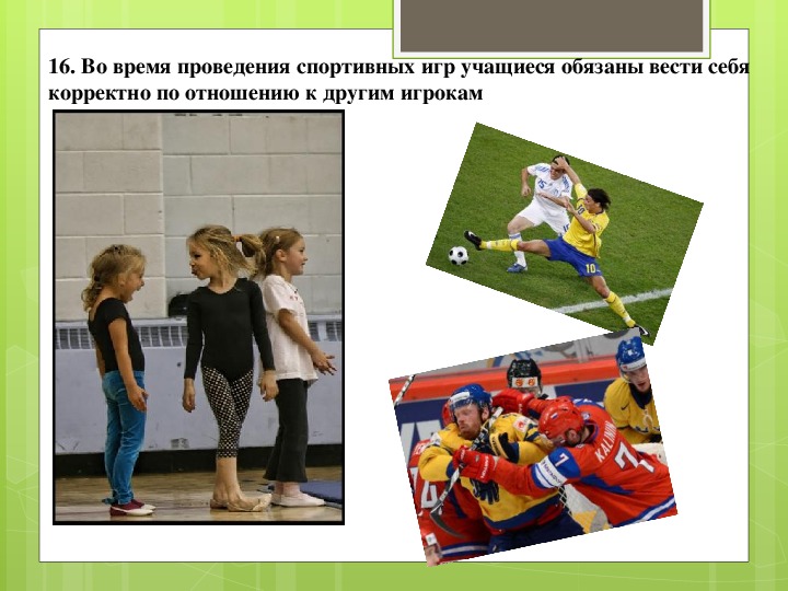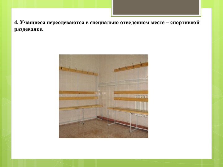 4. Учащиеся переодеваются в специально отведенном месте – спортивной раздевалке.4. Учащиеся переодеваются в специально отведенном месте – спортивной раздевалке.