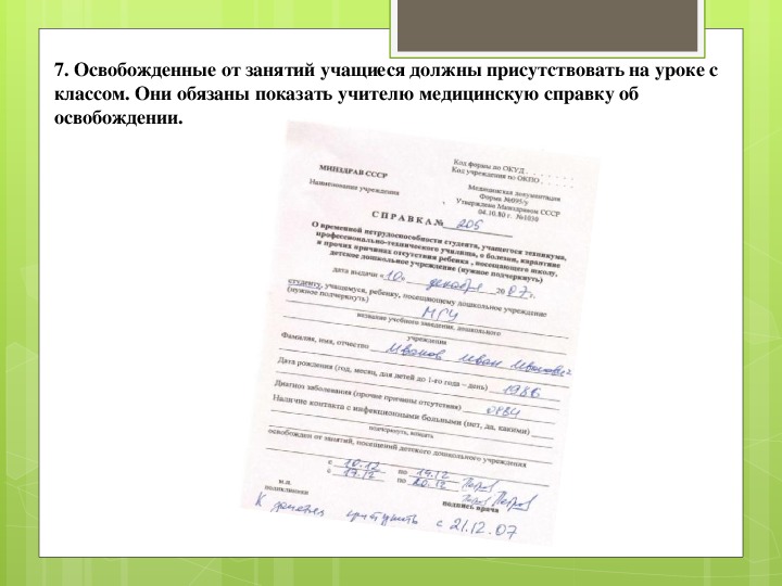 7. Освобожденные от занятий учащиеся должны присутствовать на уроке с
