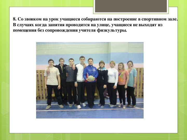 8. Со звонком на урок учащиеся собираются на построение в спортивном зале.