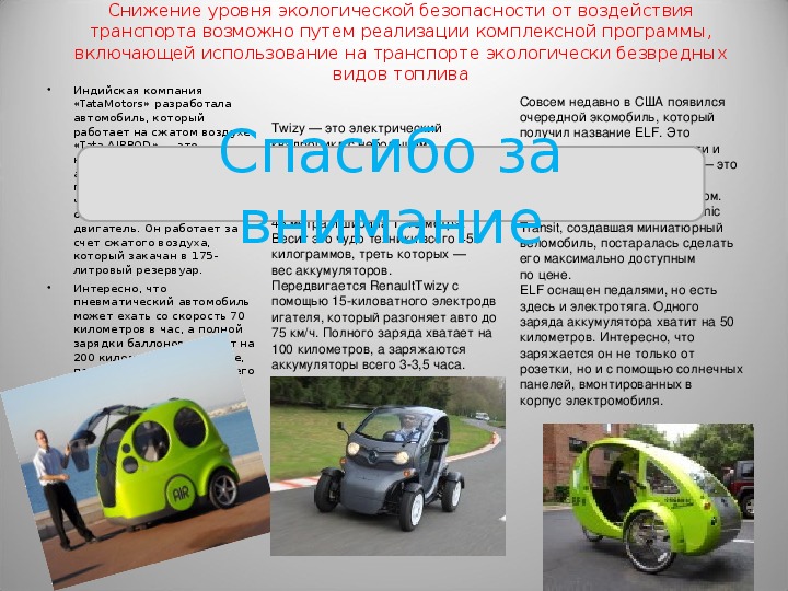 Презентацию можно использовать как учебный материал на уроках биологии и географии, при изучении экологических вопросов, в частности - загрязнение атмосферы. В ней показано влияние автотранспорта на окружающую среду. Статистический материал наглядно показывает количество выбросов в крупных городах. дан анализ метеоусловий, которые способствуют накоплению вредных примесей. Уровень загрязнения зависит и от сезонов года. приведены интересные факты о редком явлении - "химический снегопад".Снижение уровня экологической безопасности от воздействия транспорта возможно путем реализации комплексной программы, включающей использование на транспорте экологически безвредных видов топлива.