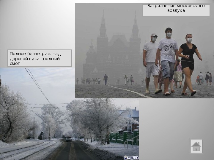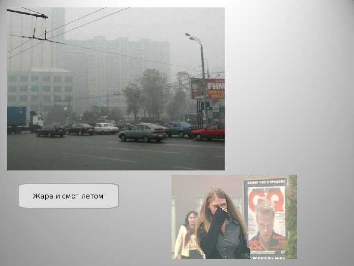 отсутствии ветра, пар от выхлопа машин висит в воздухе,