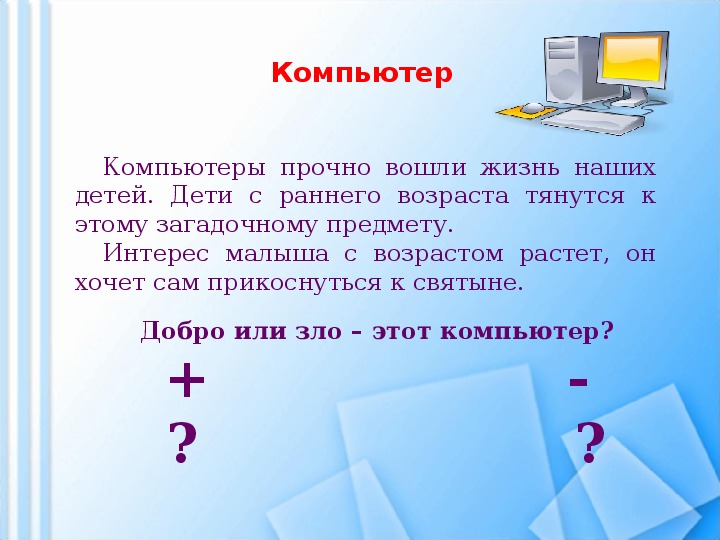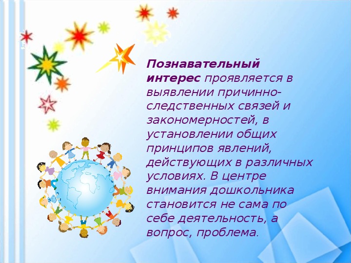Особый вид интереса — интерес к познанию или, как его принято теперь называть, познавательный интерес. Его область — познавательная деятельность, в процессе которой происходит овладение необходимыми способами, умениями и навыками, при помощи которых ребёнок получает знания.