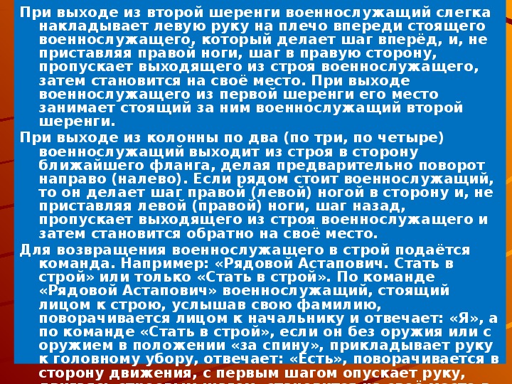 Воинское приветствие на месте .Воинское приветствие выполняется чётко и молодцевато, с точным соблюдением правил строевой стойки и движения.