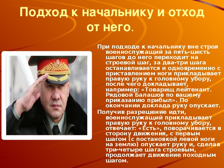 Когда начальник минует производящего воинское приветствие, голову поставить прямо и одновременно с этим опустить руку.ОСНОВЫ ВОИНСКОЙ СЛУЖБЫ