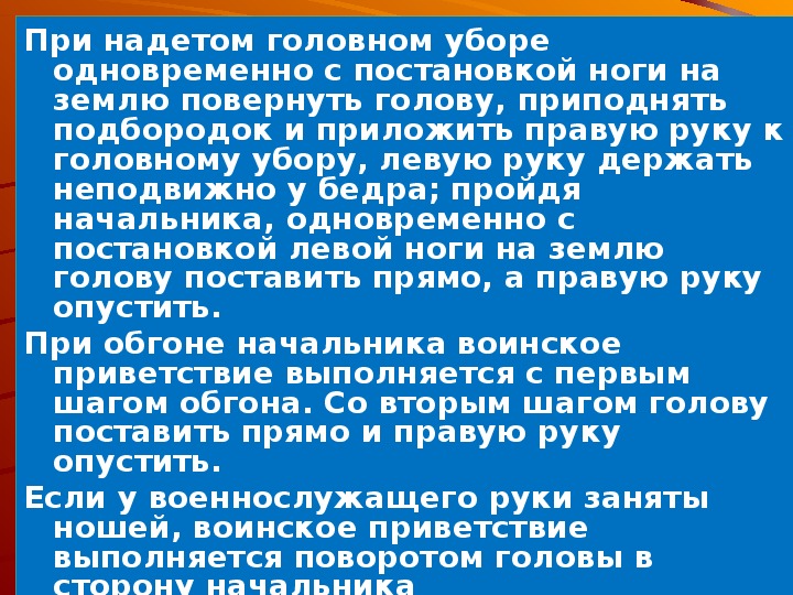 Если головной убор надет, то, кроме того, приложить правую руку к головному убору так, чтобы пальцы были вместе, ладонь прямая, средний палец касался нижнего края головного убора (у козырька), а локоть был на линии и высоте плеча. При повороте головы в сторону начальника положение руки остаётся без изменения.