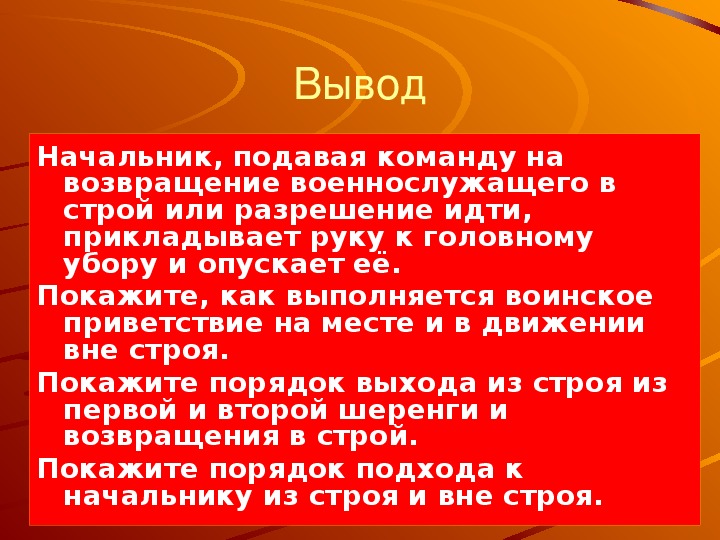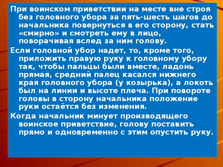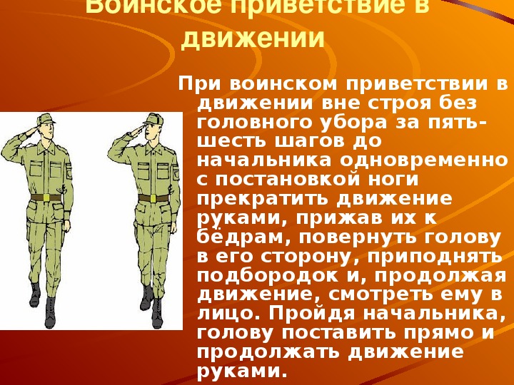 При воинском приветствии на месте вне строя без головного убора за пять-шесть шагов до начальника повернуться в его сторону, стать «смирно» и смотреть ему в лицо, поворачивая вслед за ним голову.