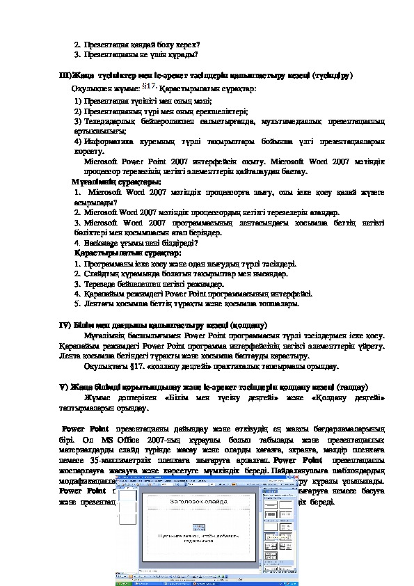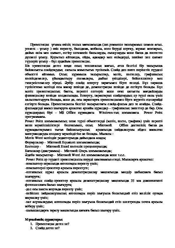 Презентация құру үшін аталған программаны меңгерту және оны қолданудың