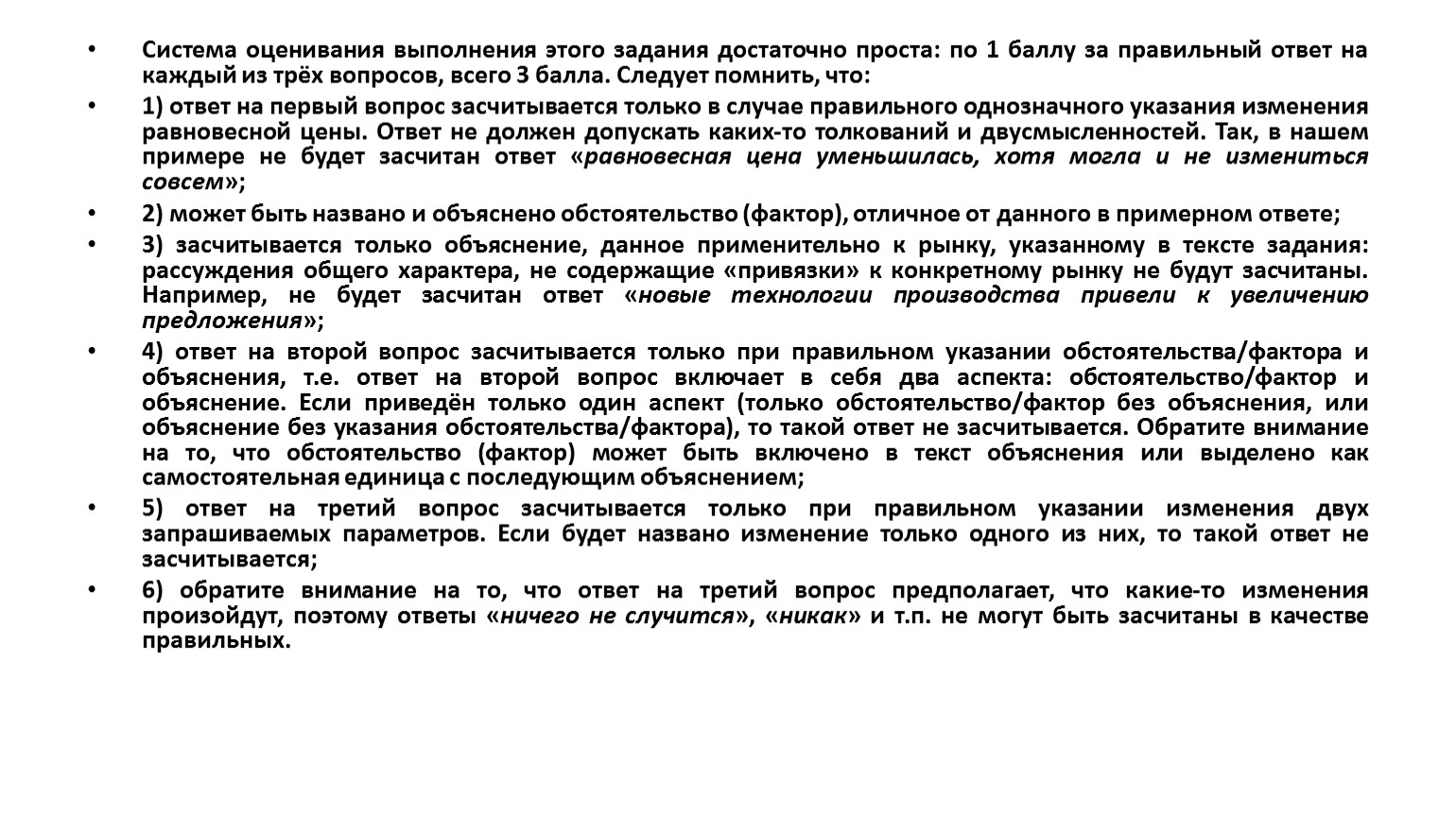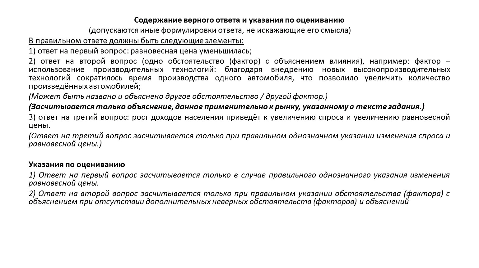 3) засчитывается только объяснение, данное применительно к рынку, указанному в тексте задания: рассуждения общего характера, не содержащие «привязки» к конкретному рынку не будут засчитаны. Например, не будет засчитан ответ «новые технологии производства привели к увеличению предложения»;