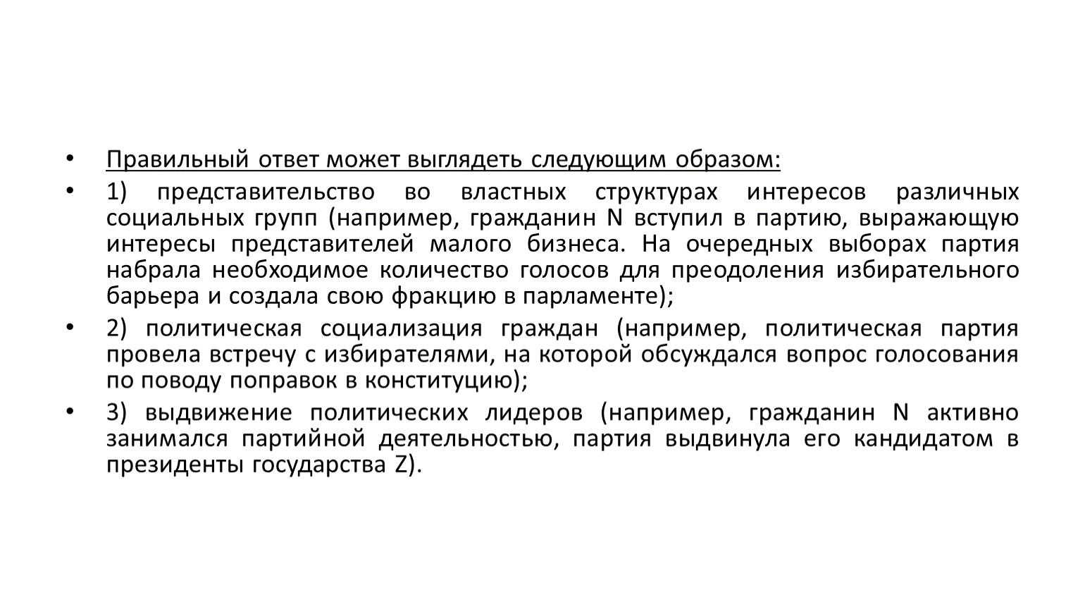 1) представительство во властных структурах интересов различных социальных групп (например, гражданин N вступил в партию, выражающую интересы представителей малого бизнеса. На очередных выборах партия набрала необходимое количество голосов для преодоления избирательного барьера и создала свою фракцию в парламенте);