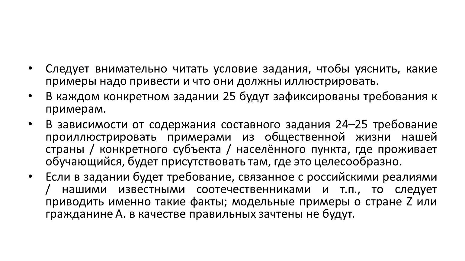 Если в задании будет требование, связанное с российскими реалиями / нашими известными соотечественниками и т.п., то следует приводить именно такие факты; модельные примеры о стране Z или гражданине А. в качестве правильных зачтены не будут.