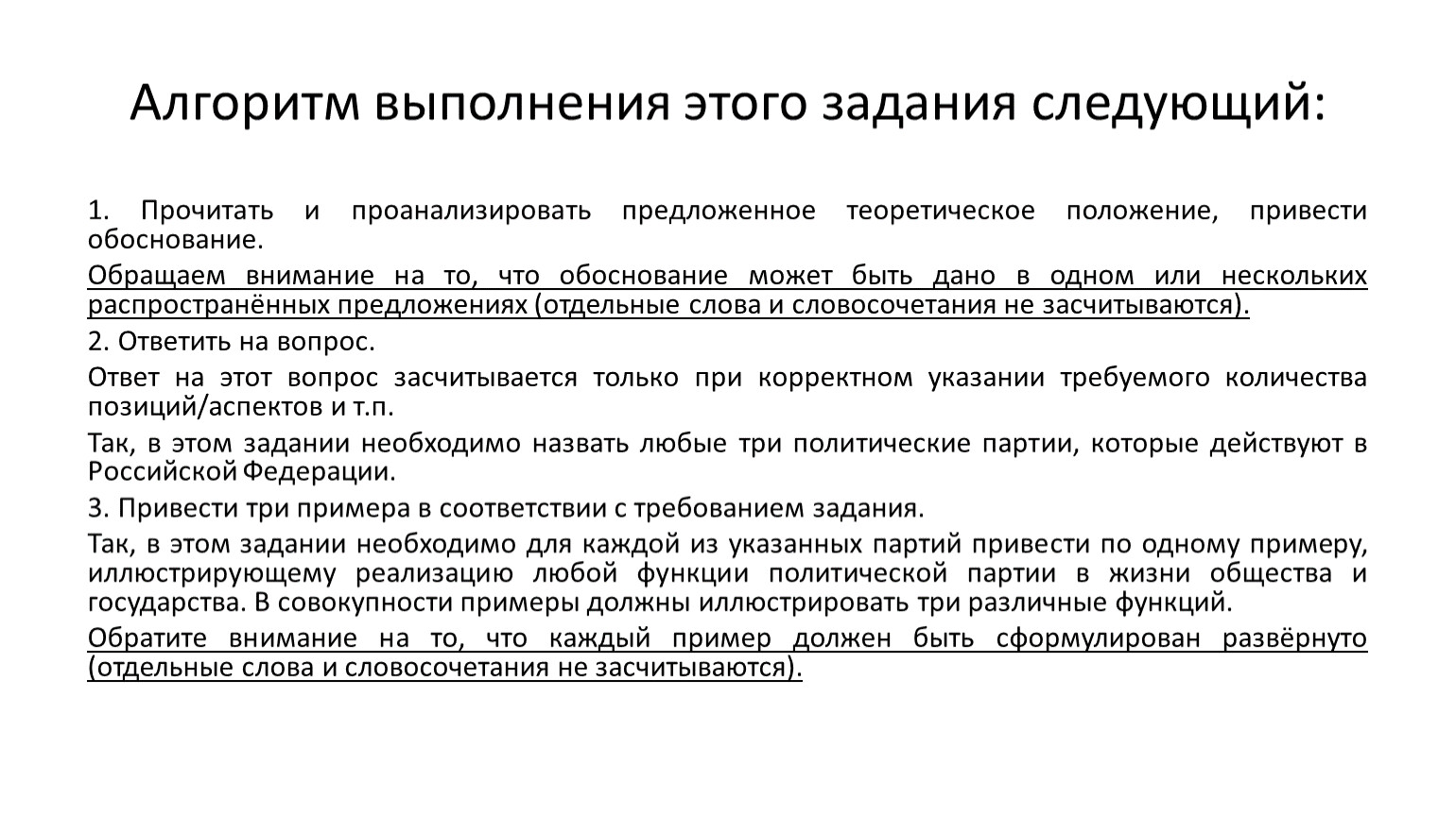 Советуем сначала внимательно прочитать задание, обращая внимание не только на содержание, но и на требуемое количество элементов, необходимых для получения максимального балла. В данном задании их пять: обоснование, ответ на вопрос и три примера.