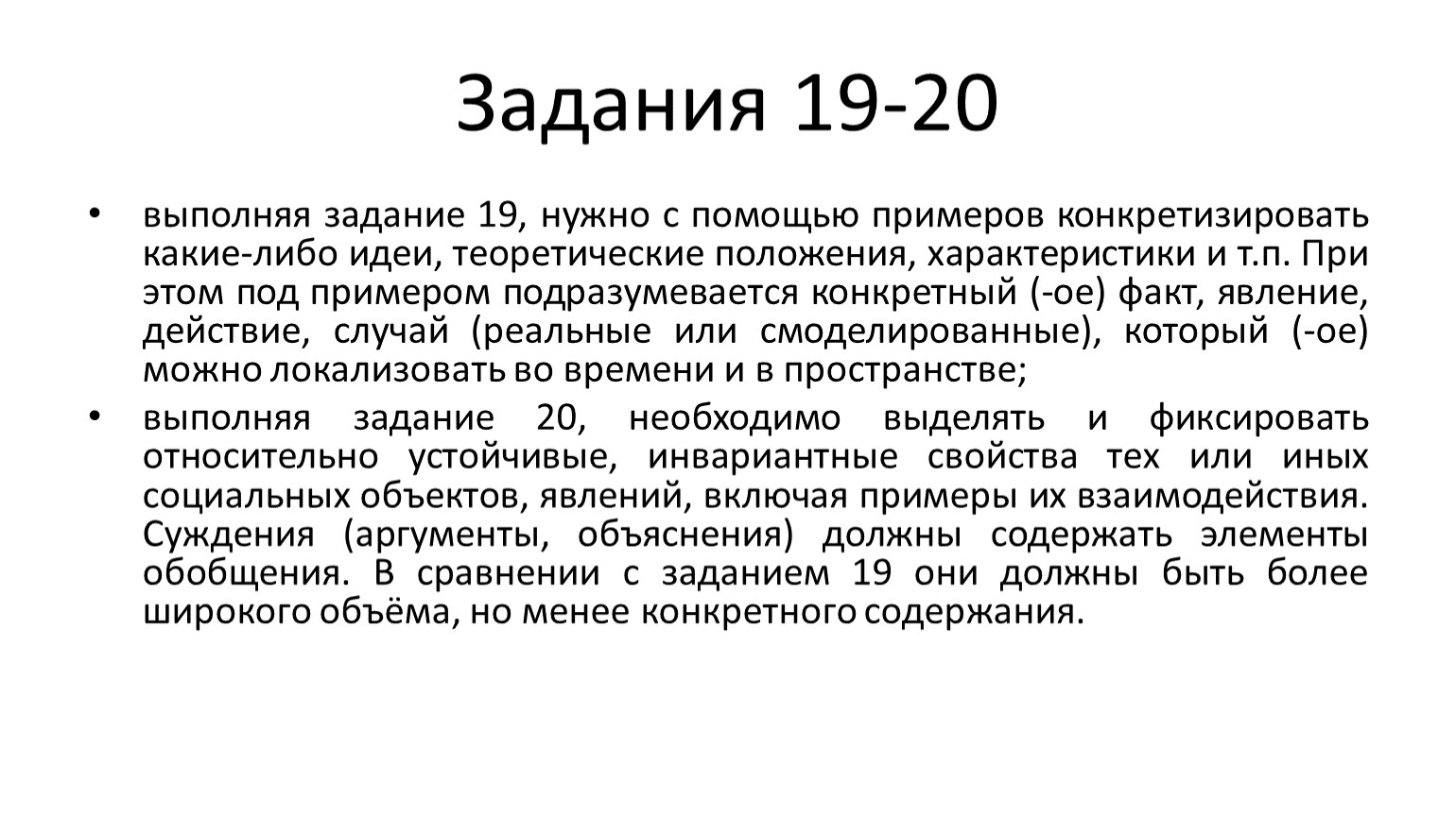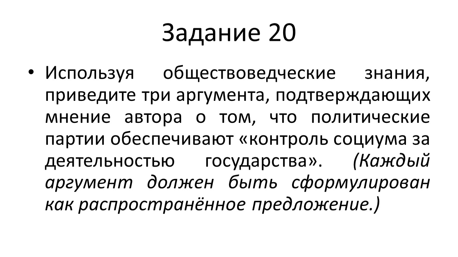 выполняя задание 20, необходимо выделять и фиксировать относительно устойчивые, инвариантные свойства тех или иных социальных объектов, явлений, включая примеры их взаимодействия. Суждения (аргументы, объяснения) должны содержать элементы обобщения. В сравнении с заданием 19 они должны быть более широкого объёма, но менее конкретного содержания.