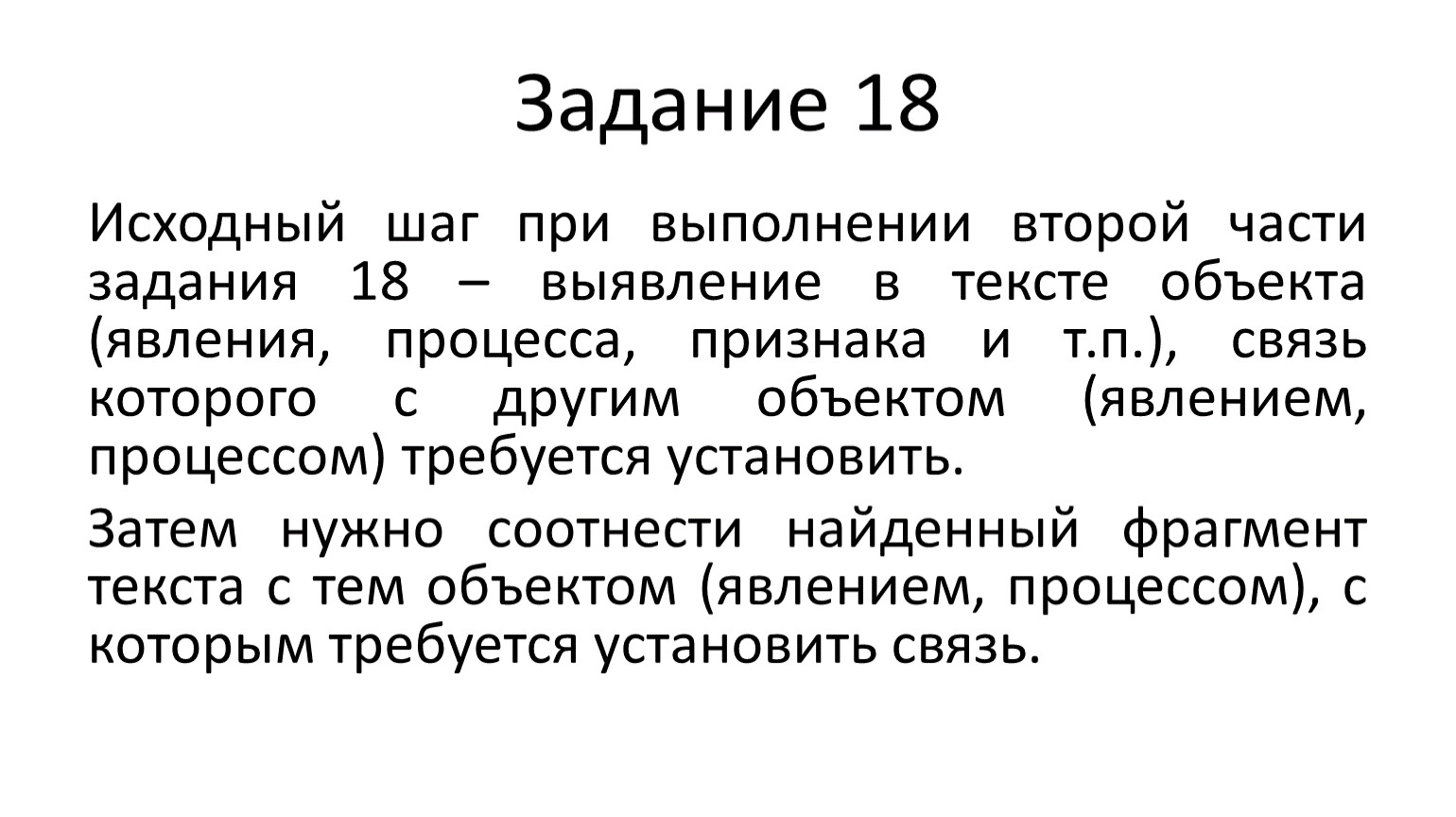 Исходный шаг при выполнении второй части задания 18 – выявление в тексте объекта (явления, процесса, признака и т.п.), связь которого с другим объектом (явлением, процессом) требуется установить.