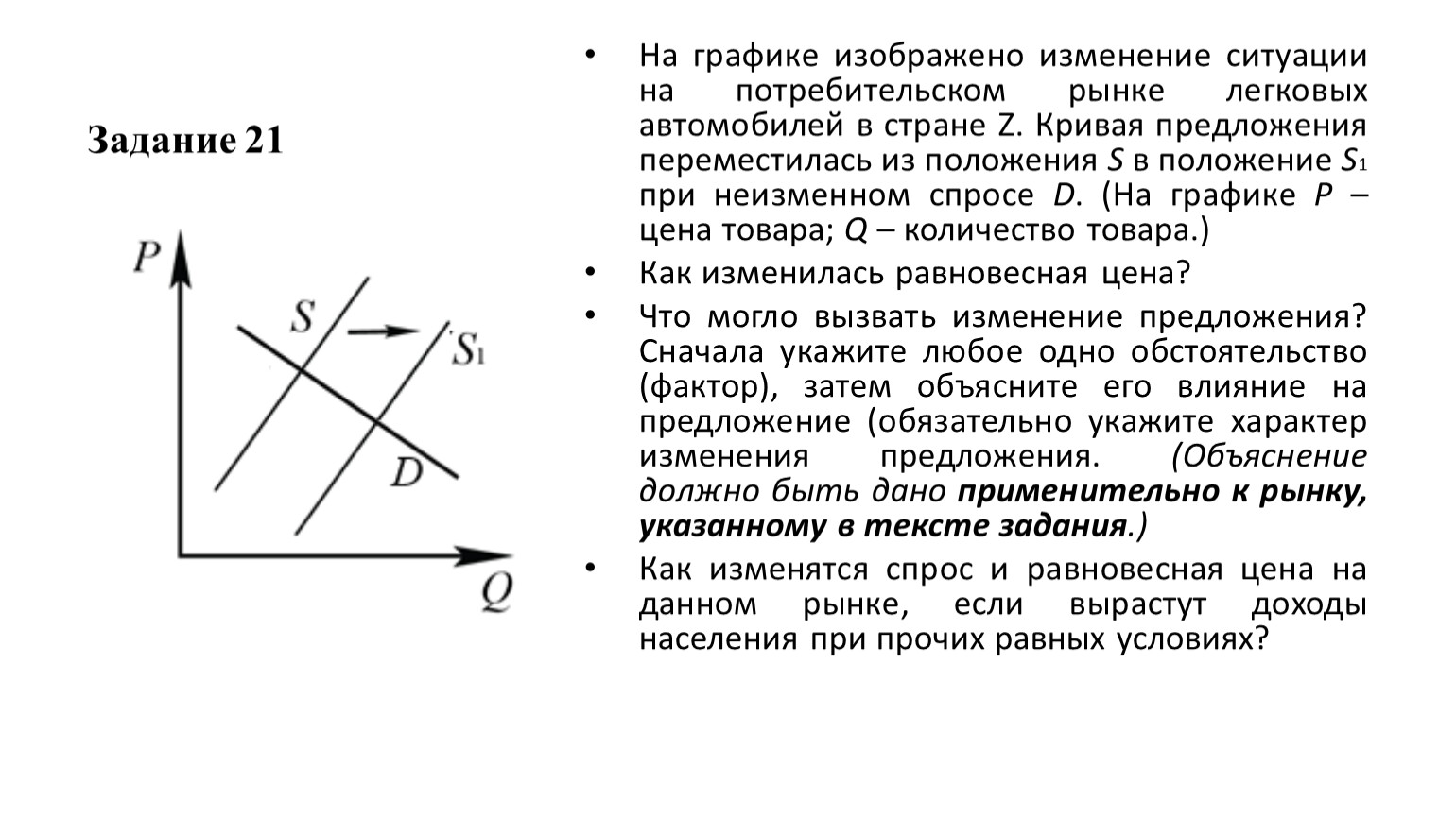 На графике изображено изменение ситуации на потребительском рынке легковых автомобилей в стране Z. Кривая предложения переместилась из положения S в положение S1 при неизменном спросе D. (На графике P – цена товара; Q – количество товара.)