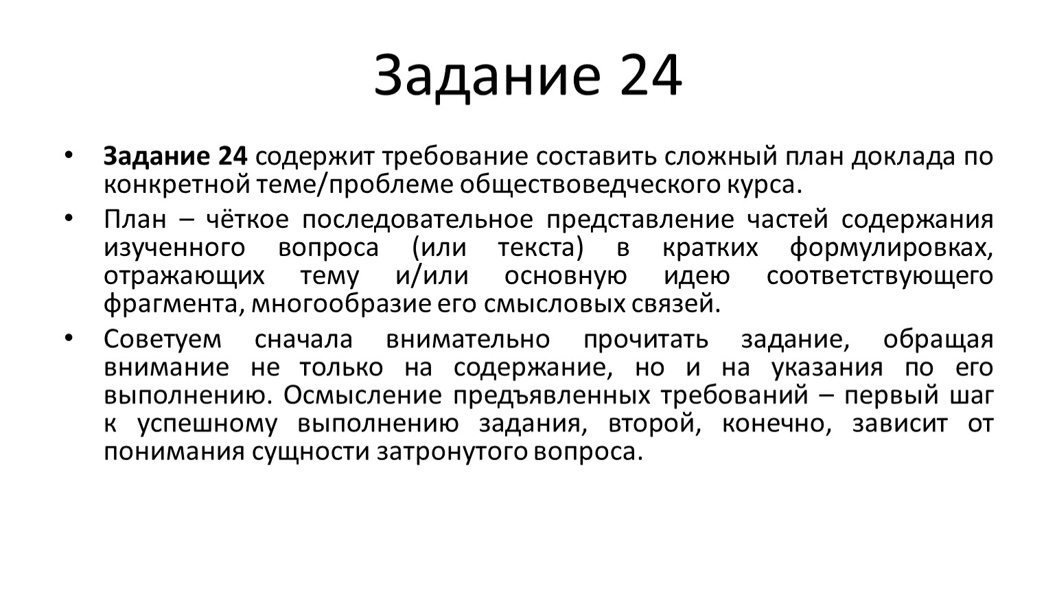 Задание 24 содержит требование составить сложный план доклада по конкретной теме/проблеме обществоведческого курса.