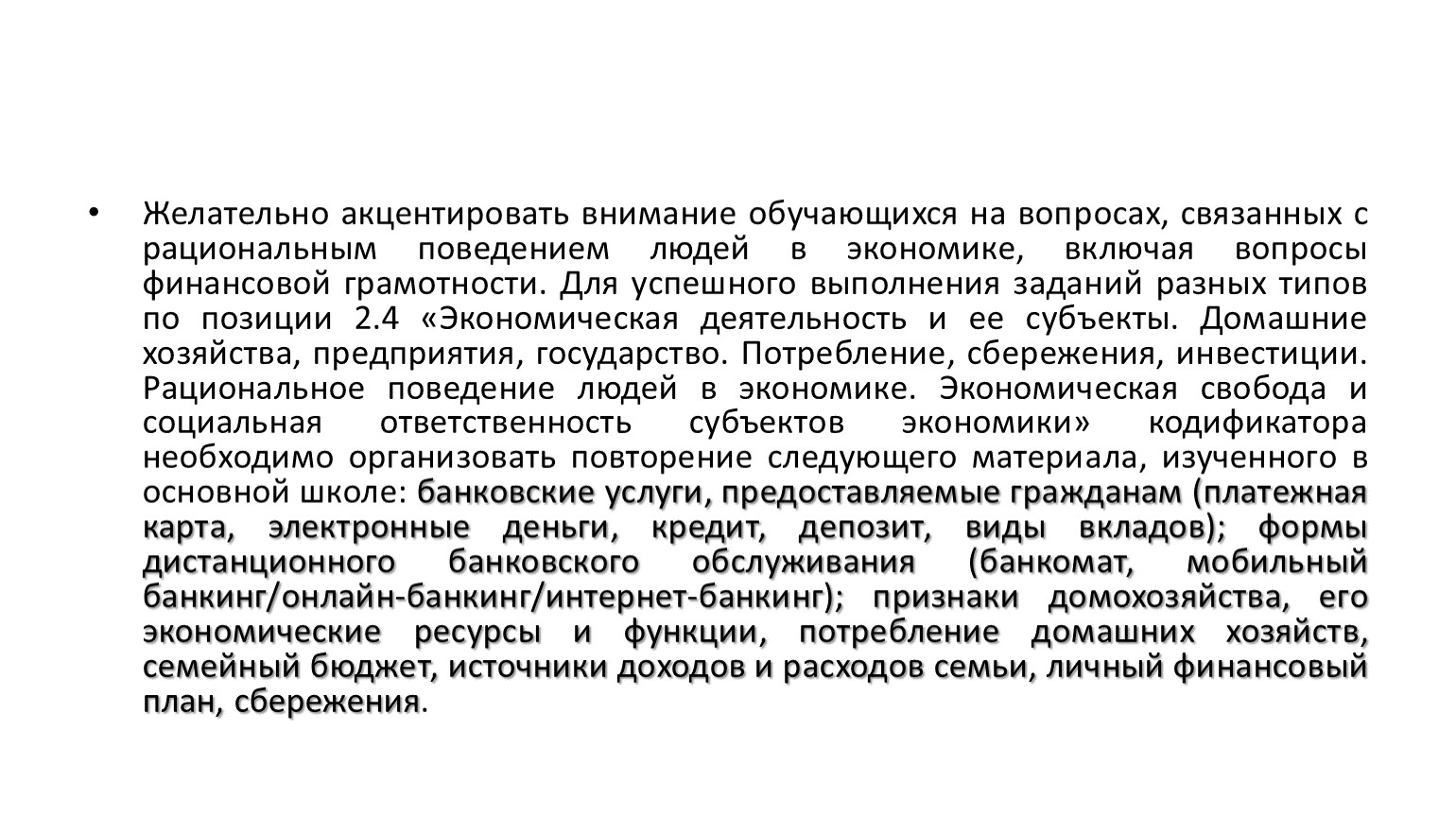 Желательно акцентировать внимание обучающихся на вопросах, связанных с рациональным поведением людей в экономике, включая вопросы финансовой грамотности. Для успешного выполнения заданий разных типов по позиции 2.4 «Экономическая деятельность и ее субъекты. Домашние хозяйства, предприятия, государство. Потребление, сбережения, инвестиции. Рациональное поведение людей в экономике. Экономическая свобода и социальная ответственность субъектов экономики» кодификатора необходимо организовать повторение следующего материала, изученного в основной школе: банковские услуги, предоставляемые гражданам (платежная карта, электронные деньги, кредит, депозит, виды вкладов); формы дистанционного банковского обслуживания (банкомат, мобильный банкинг/онлайн-банкинг/интернет-банкинг); признаки домохозяйства, его экономические ресурсы и функции, потребление домашних хозяйств, семейный бюджет, источники доходов и расходов семьи, личный финансовый план, сбережения.
