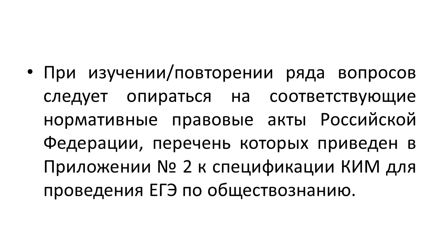 При изучении/повторении ряда вопросов следует опираться на соответствующие нормативные правовые акты Российской Федерации, перечень которых приведен в Приложении № 2 к спецификации КИМ для проведения ЕГЭ по обществознанию.