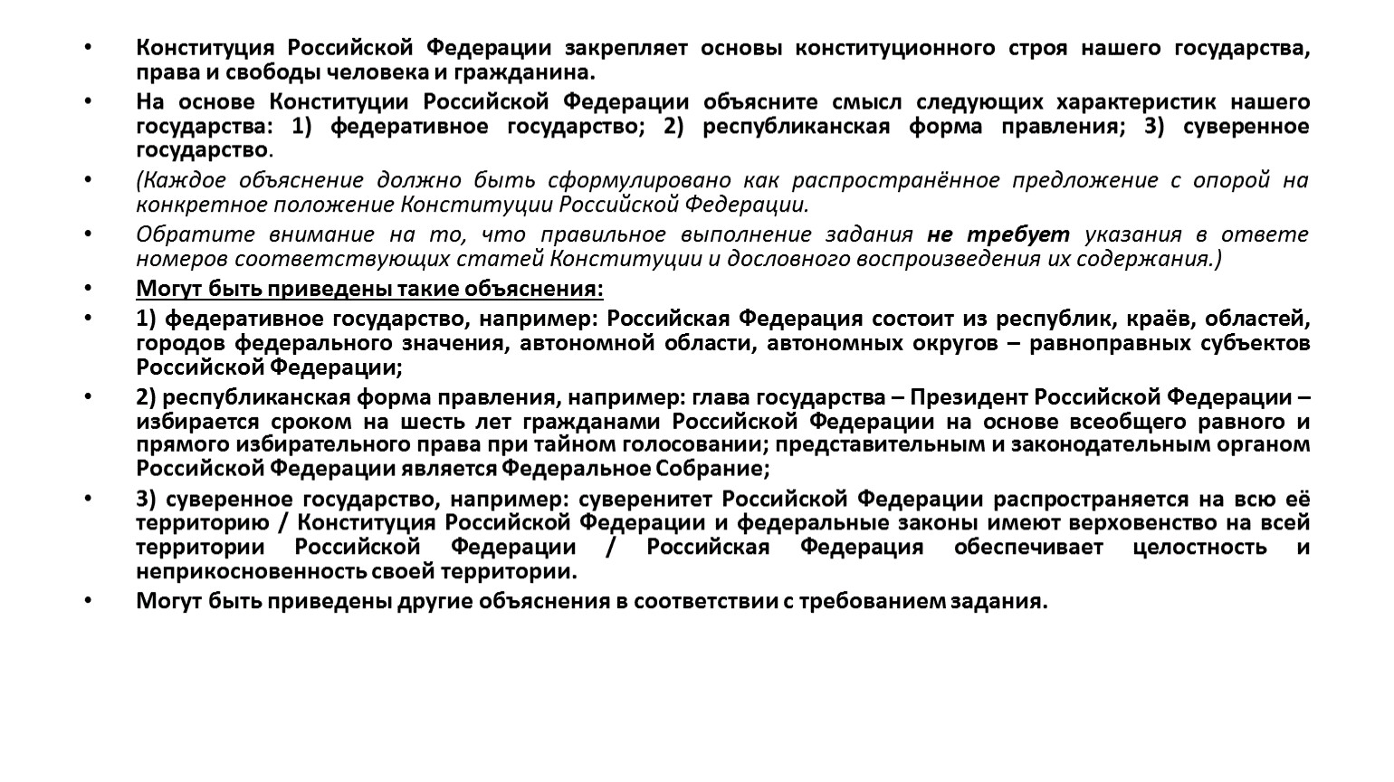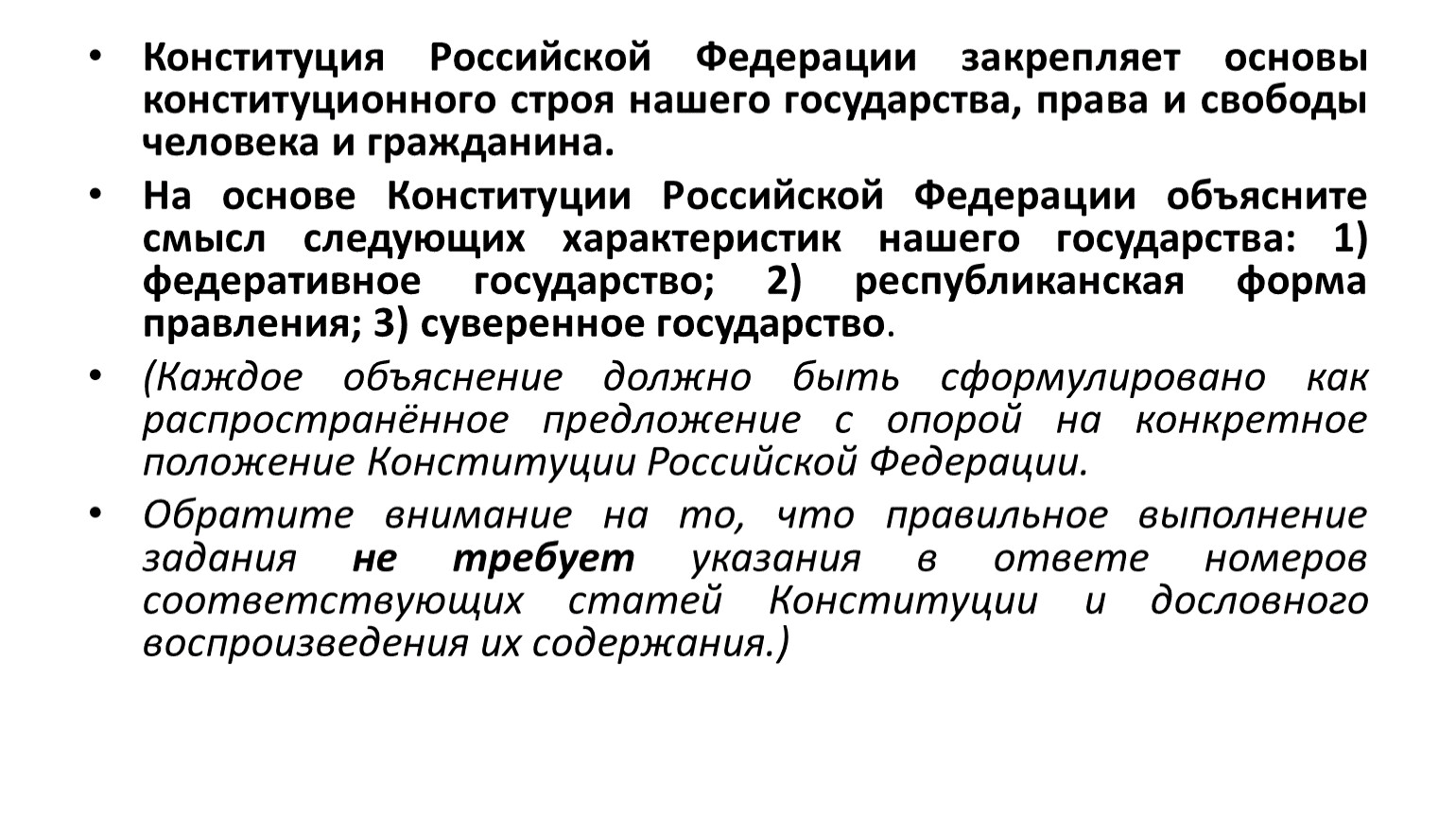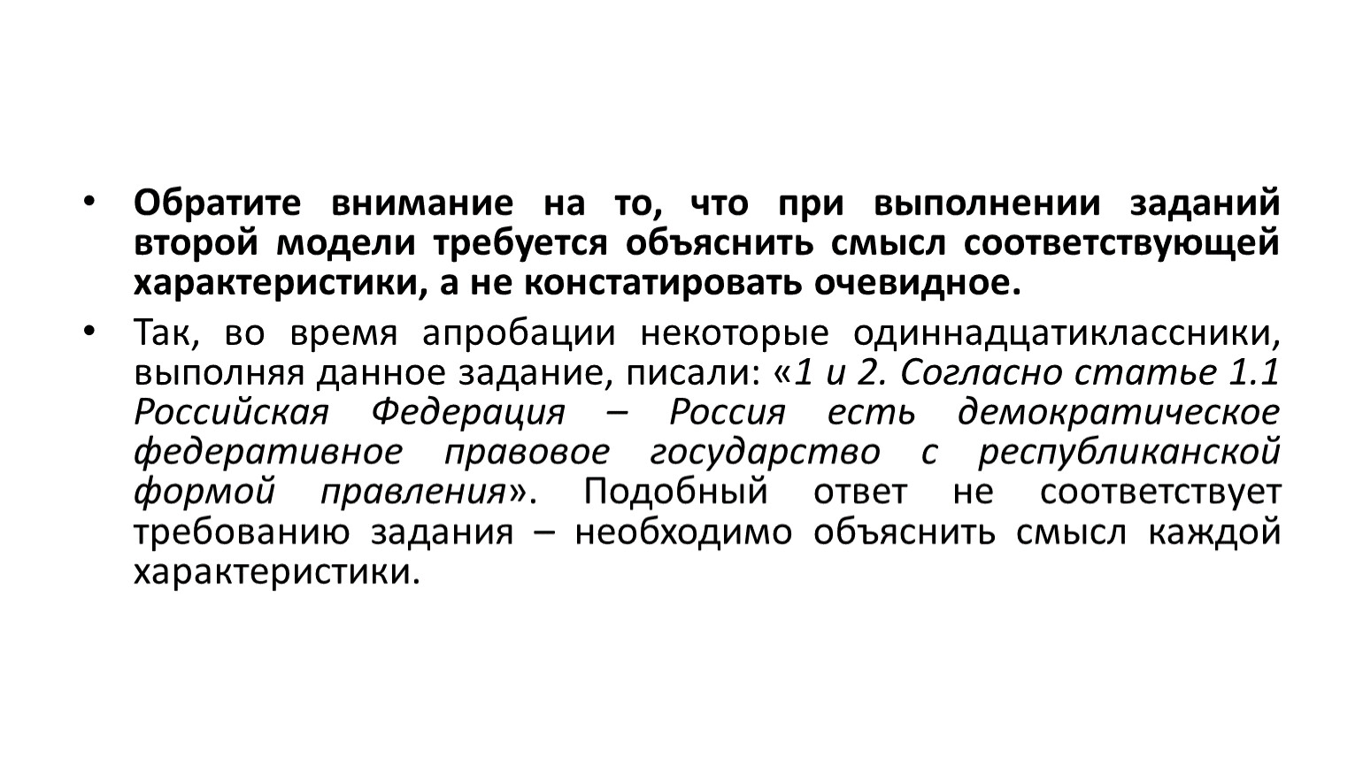 Так, во время апробации некоторые одиннадцатиклассники, выполняя данное задание, писали: «1 и 2. Согласно статье 1.1 Российская Федерация – Россия есть демократическое федеративное правовое государство с республиканской формой правления». Подобный ответ не соответствует требованию задания – необходимо объяснить смысл каждой характеристики.