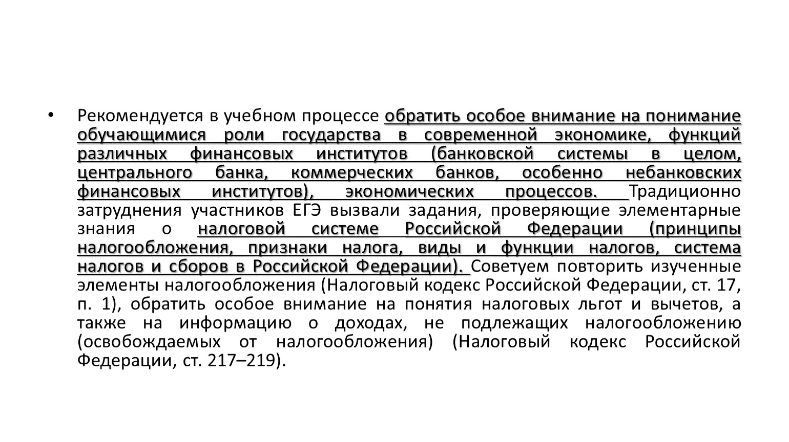 Рекомендуется в учебном процессе обратить особое внимание на понимание обучающимися роли государства в современной экономике, функций различных финансовых институтов (банковской системы в целом, центрального банка, коммерческих банков, особенно небанковских финансовых институтов), экономических процессов. Традиционно затруднения участников ЕГЭ вызвали задания, проверяющие элементарные знания о налоговой системе Российской Федерации (принципы налогообложения, признаки налога, виды и функции налогов, система налогов и сборов в Российской Федерации). Советуем повторить изученные элементы налогообложения (Налоговый кодекс Российской Федерации, ст. 17, п. 1), обратить особое внимание на понятия налоговых льгот и вычетов, а также на информацию о доходах, не подлежащих налогообложению (освобождаемых от налогообложения) (Налоговый кодекс Российской Федерации, ст. 217–219).