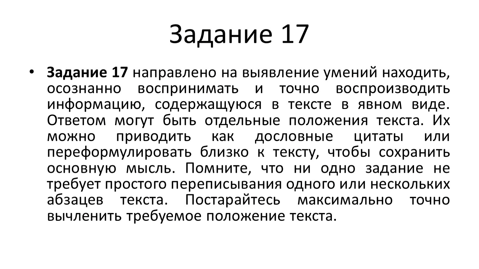 Задание 17 направлено на выявление умений находить, осознанно воспринимать и точно воспроизводить информацию, содержащуюся в тексте в явном виде. Ответом могут быть отдельные положения текста. Их можно приводить как дословные цитаты или переформулировать близко к тексту, чтобы сохранить основную мысль. Помните, что ни одно задание не требует простого переписывания одного или нескольких абзацев текста. Постарайтесь максимально точно вычленить требуемое положение текста.