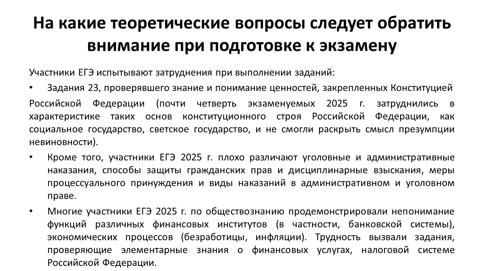 Российской Федерации (почти четверть экзаменуемых 2025 г. затруднились в характеристике таких основ конституционного строя Российской Федерации, как социальное государство, светское государство, и не смогли раскрыть смысл презумпции невиновности).
