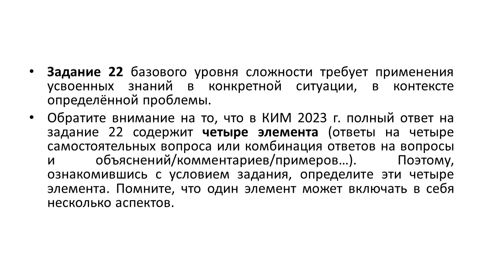 Обратите внимание на то, что в КИМ 2023 г. полный ответ на задание 22 содержит четыре элемента (ответы на четыре самостоятельных вопроса или комбинация ответов на вопросы и объяснений/комментариев/примеров…). Поэтому, ознакомившись с условием задания, определите эти четыре элемента. Помните, что один элемент может включать в себя несколько аспектов.