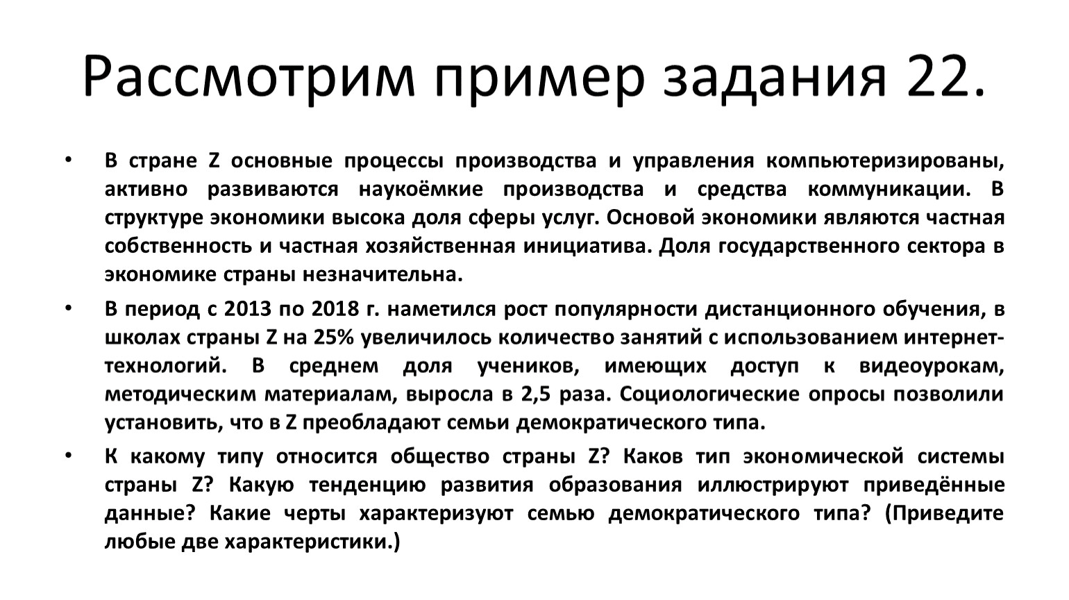 В стране Z основные процессы производства и управления компьютеризированы, активно развиваются наукоёмкие производства и средства коммуникации. В структуре экономики высока доля сферы услуг. Основой экономики являются частная собственность и частная хозяйственная инициатива. Доля государственного сектора в экономике страны незначительна.