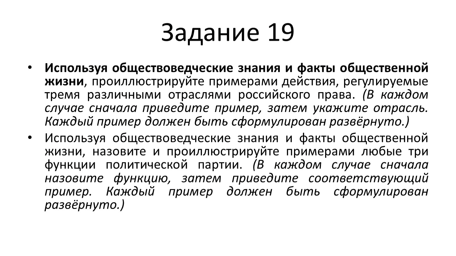 выполняя задание 19, нужно с помощью примеров конкретизировать какие-либо идеи, теоретические положения, характеристики и т.п. При этом под примером подразумевается конкретный (-ое) факт, явление, действие, случай (реальные или смоделированные), который (-ое) можно локализовать во времени и в пространстве;