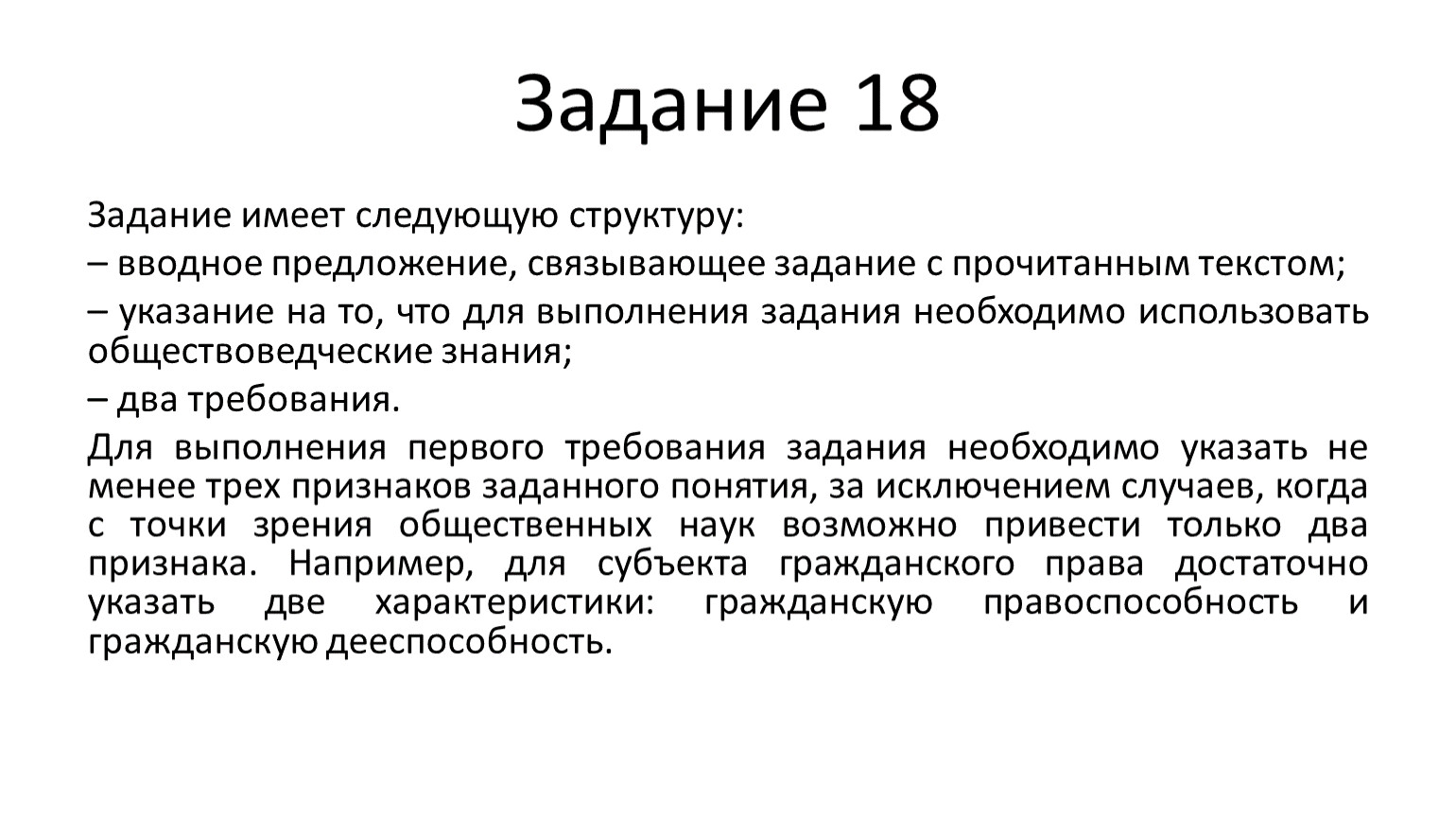 Для выполнения первого требования задания необходимо указать не менее трех признаков заданного понятия, за исключением случаев, когда с точки зрения общественных наук возможно привести только два признака. Например, для субъекта гражданского права достаточно указать две характеристики: гражданскую правоспособность и гражданскую дееспособность.