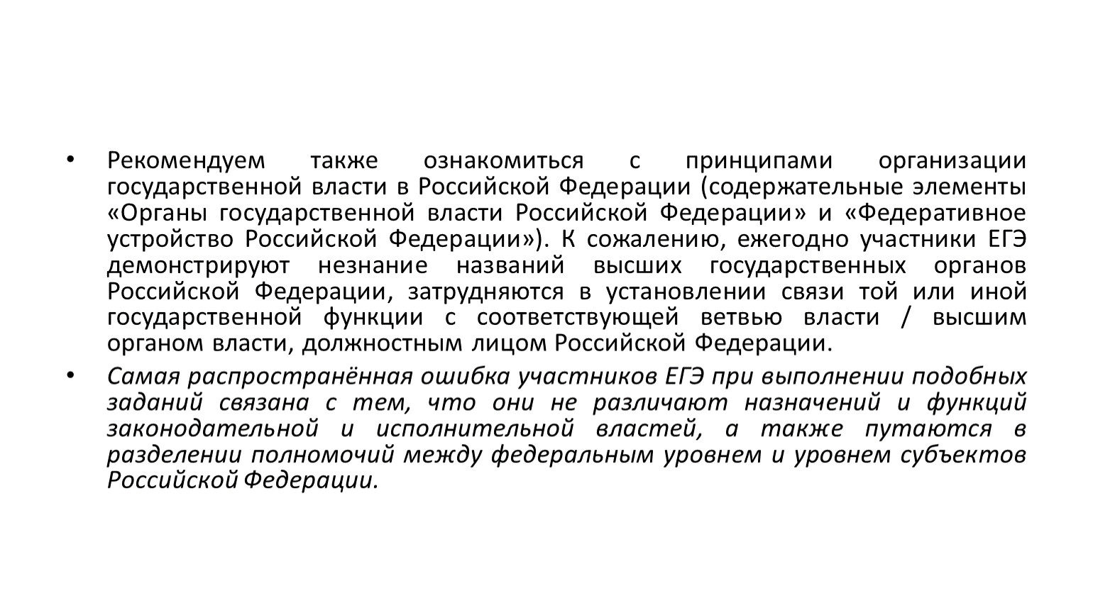 Самая распространённая ошибка участников ЕГЭ при выполнении подобных заданий связана с тем, что они не различают назначений и функций законодательной и исполнительной властей, а также путаются в разделении полномочий между федеральным уровнем и уровнем субъектов Российской Федерации.