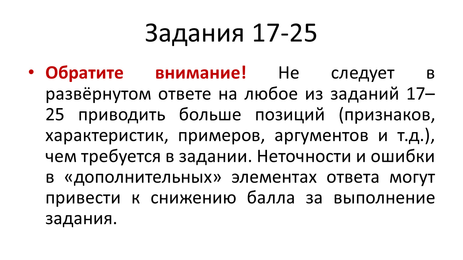 Обратите внимание! Не следует в развёрнутом ответе на любое из заданий 17–25 приводить больше позиций (признаков, характеристик, примеров, аргументов и т.д.), чем требуется в задании. Неточности и ошибки в «дополнительных» элементах ответа могут привести к снижению балла за выполнение задания.