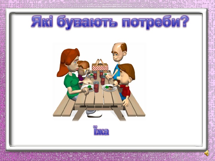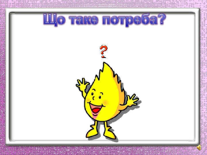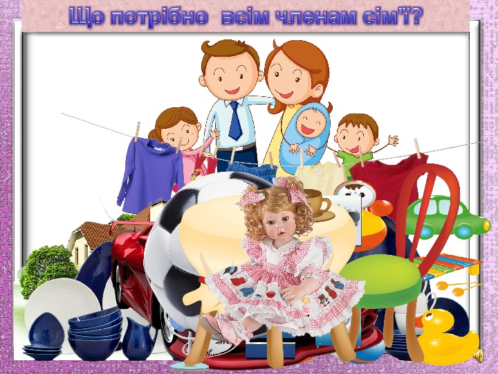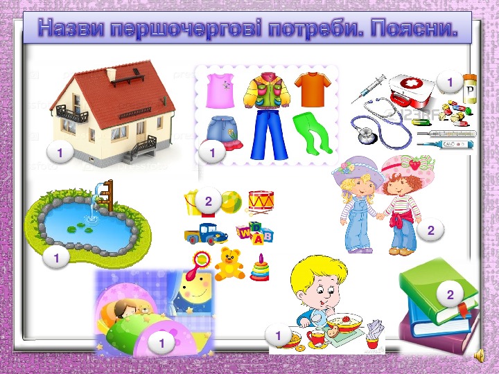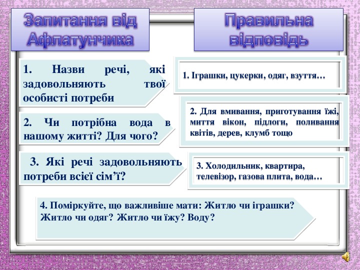 1. Назви речі, які задовольняють твої особисті потреби2. Чи потрібна вода в нашому житті? Для чого? 3. Які речі задовольняють потреби всієї сім’ї? 4. Поміркуйте, що важливіше мати: Житло чи іграшки? Житло чи одяг? Житло чи їжу? Воду? 1. Іграшки, цукерки, одяг, взуття… 2. Для вмивання, приготування їжі, миття вікон, підлоги, поливання квітів, дерев, клумб тощо 3. Холодильник, квартира, телевізор, газова плита, вода…