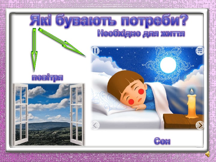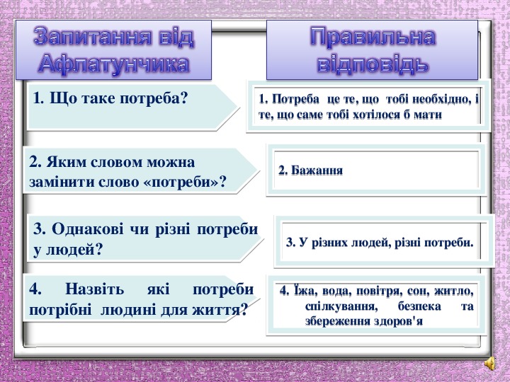 1. Що таке потреба? 2. Яким словом можна замінити слово «потреби»?3. Однакові чи різні потреби у людей? 4. Назвіть які потреби потрібні людині для життя? 1. Потреба це те, що тобі необхідно, і те, що саме тобі хотілося б мати2. Бажання 3. У різних людей, різні потреби. 4. Їжа, вода, повітря, сон, житло, спілкування, безпека та збереження здоров'я