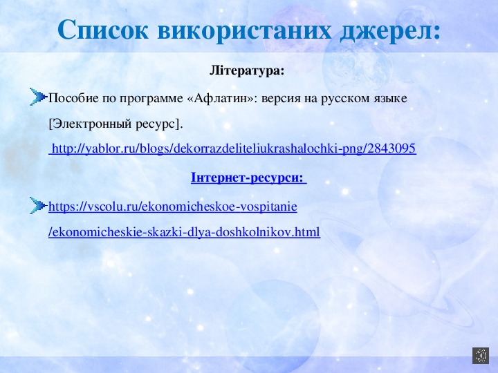 Презентація спрямована на формування фінансової грамотності та розвитку соціально-моральних якостей дитини старшого дошкільного віку.Пропонується цікава економічна казка для дітей дошкільного віку та їхніх батьків. В презентації розповідається про пригоди жадібного Афлатота на планеті Афлатунії, вчить вихованців економності, бажання берегти природу рідного краю.