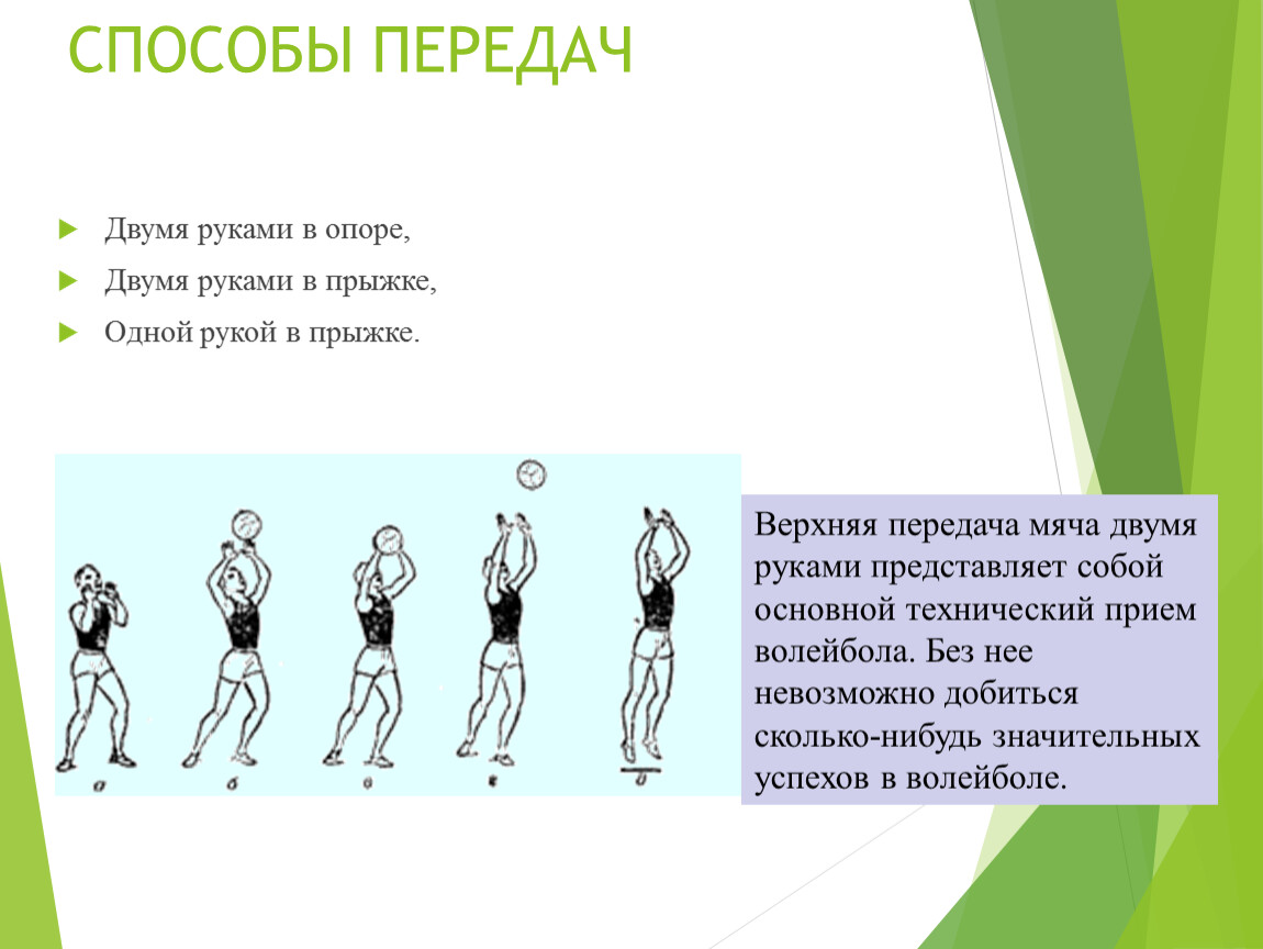 Верхняя передача мяча двумя руками представляет собой основной технический прием волейбола. Без нее невозможно добиться сколько-нибудь значительных успехов в волейболе.
