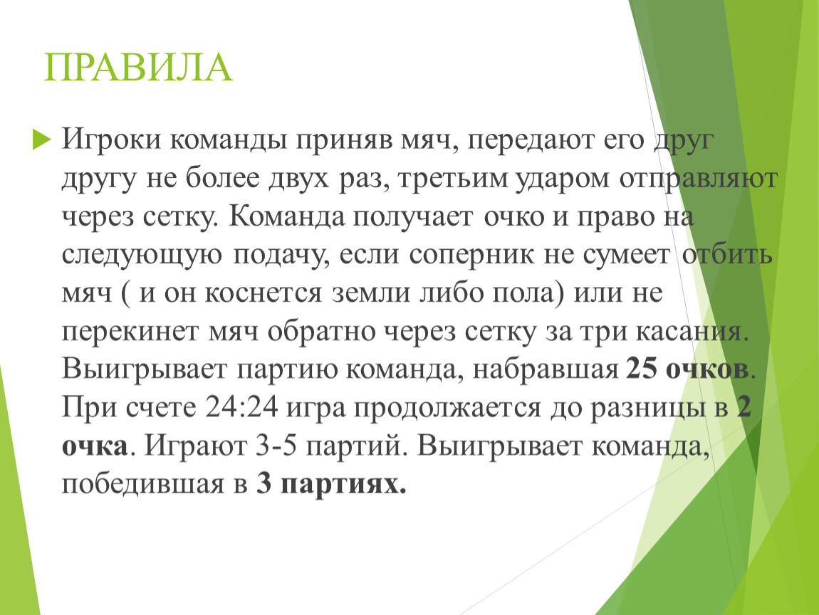 Игроки команды приняв мяч, передают его друг другу не более двух раз, третьим ударом отправляют через сетку. Команда получает очко и право на следующую подачу, если соперник не сумеет отбить мяч ( и он коснется земли либо пола) или не перекинет мяч обратно через сетку за три касания. Выигрывает партию команда, набравшая 25 очков. При счете 24:24 игра продолжается до разницы в 2 очка. Играют 3-5 партий. Выигрывает команда, победившая в 3 партиях.