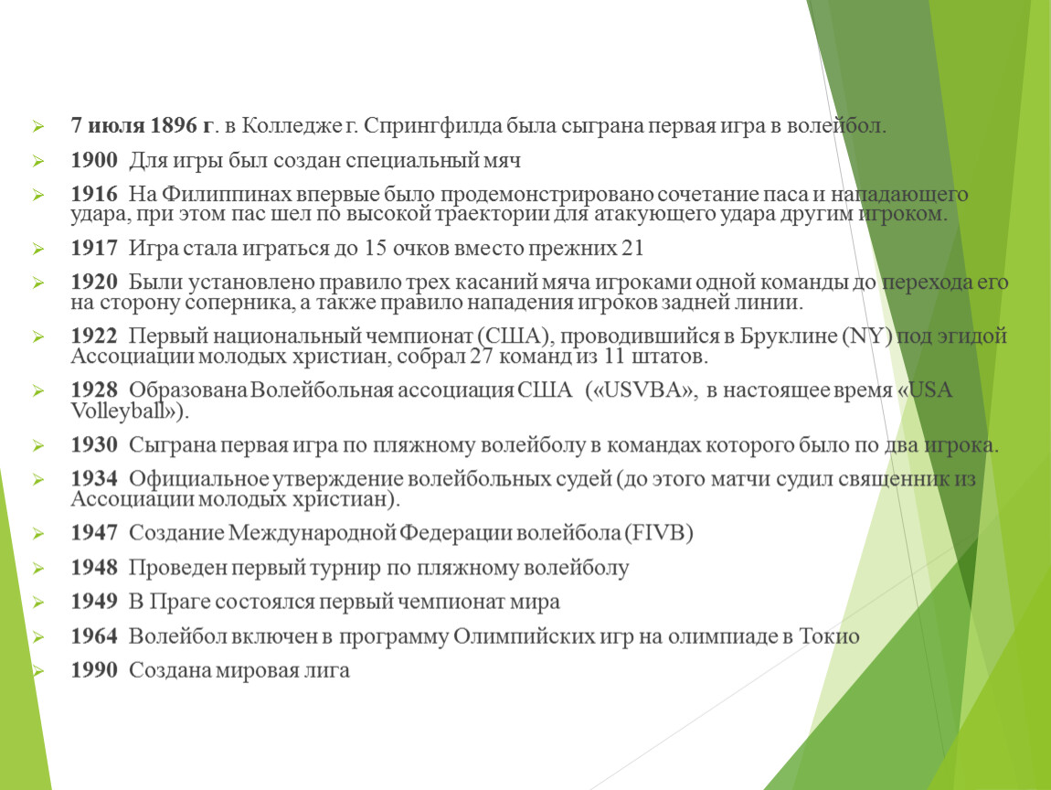 7 июля 1896 г. в Колледже г. Спрингфилда была сыграна первая игра в волейбол.