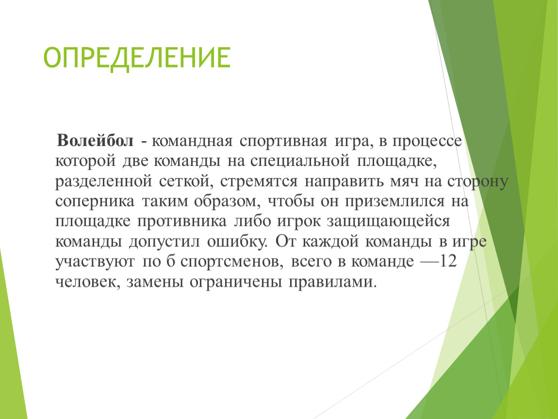Волейбол - командная спортивная игра, в процессе которой две команды на специальной площадке, разделенной сеткой, стремятся направить мяч на сторону соперника таким образом, чтобы он приземлился на площадке противника либо игрок защищающейся команды допустил ошибку. От каждой команды в игре участвуют по б спортсменов, всего в команде —12 человек, замены ограничены правилами.
