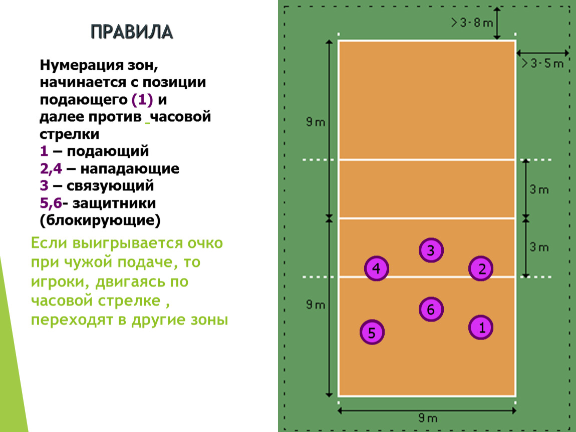 Нумерация зон, начинается с позиции подающего (1) и далее против часовой стрелки