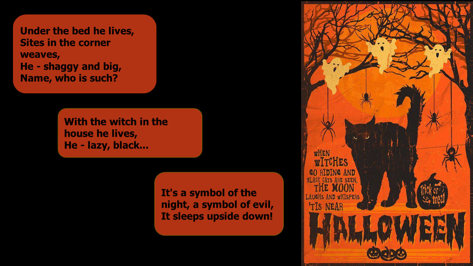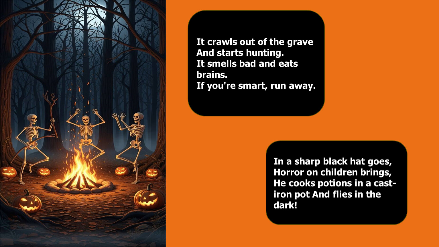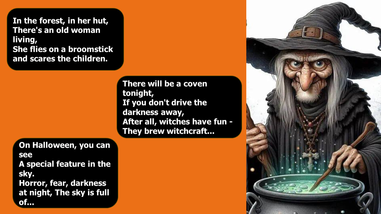He cooks potions in a cast-iron pot And flies in the dark!