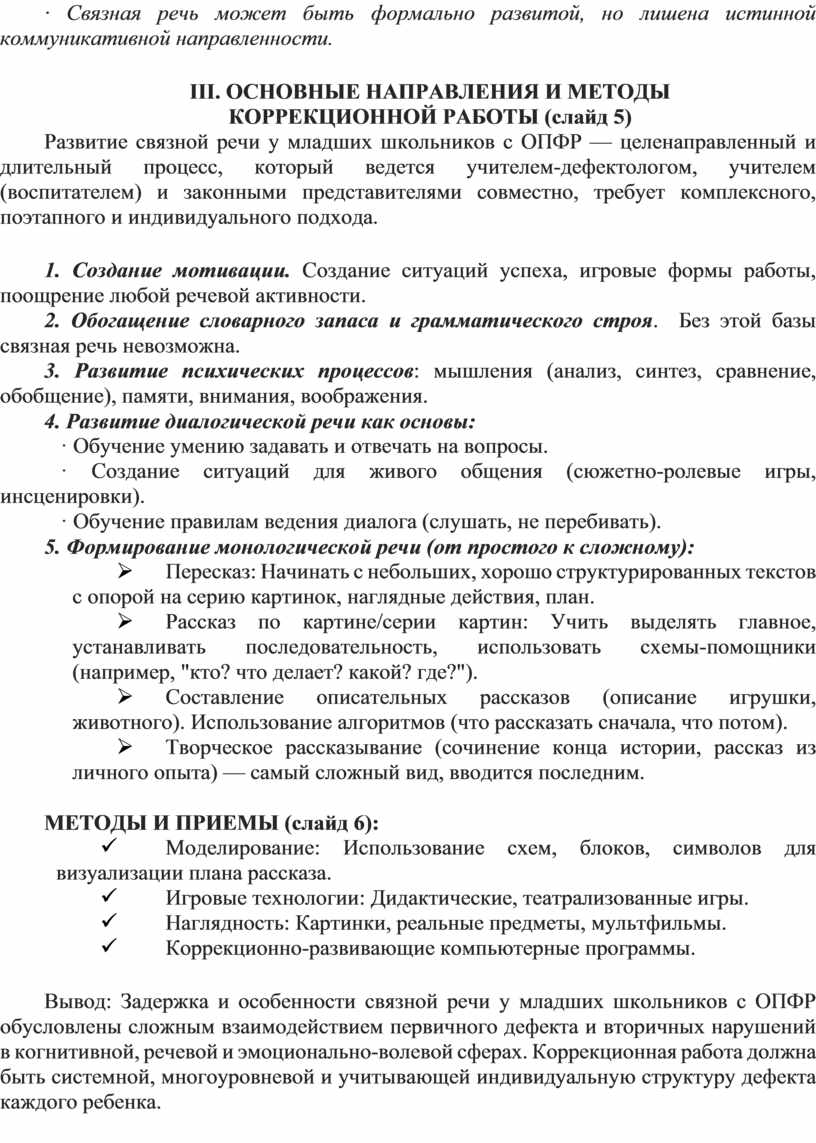 Вывод: Задержка и особенности связной речи у младших школьников с ОПФР обусловлены сложным взаимодействием первичного дефекта и вторичных нарушений в когнитивной, речевой и эмоционально-волевой сферах. Коррекционная работа должна быть системной, многоуровневой и учитывающей индивидуальную структуру дефекта каждого ребенка.