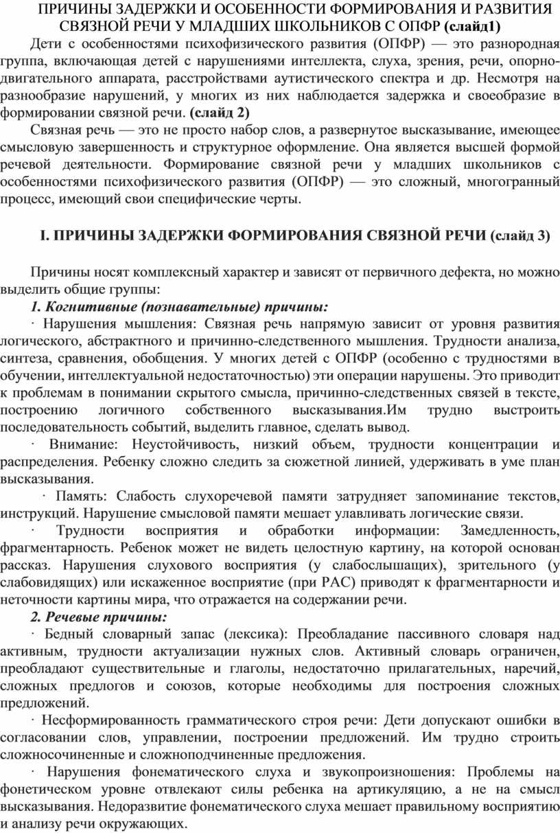 ПРИЧИНЫ ЗАДЕРЖКИ И ОСОБЕННОСТИ ФОРМИРОВАНИЯ И РАЗВИТИЯ СВЯЗНОЙ РЕЧИ У МЛАДШИХ ШКОЛЬНИКОВ С ОПФР (слайд1)