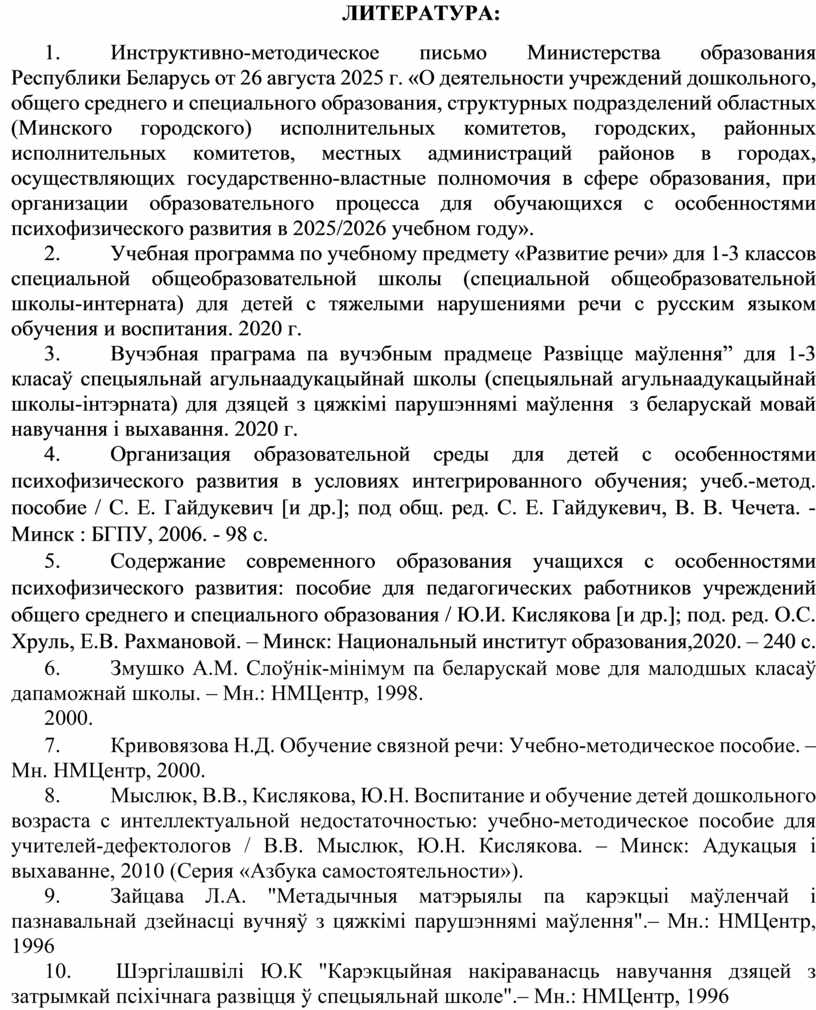 1. Инструктивно-методическое письмо Министерства образования Республики Беларусь от 26 августа 2025 г. «О деятельности учреждений дошкольного, общего среднего и специального образования, структурных подразделений областных (Минского городского) исполнительных комитетов, городских, районных исполнительных комитетов, местных администраций районов в городах, осуществляющих государственно-властные полномочия в сфере образования, при организации образовательного процесса для обучающихся с особенностями психофизического развития в 2025/2026 учебном году».